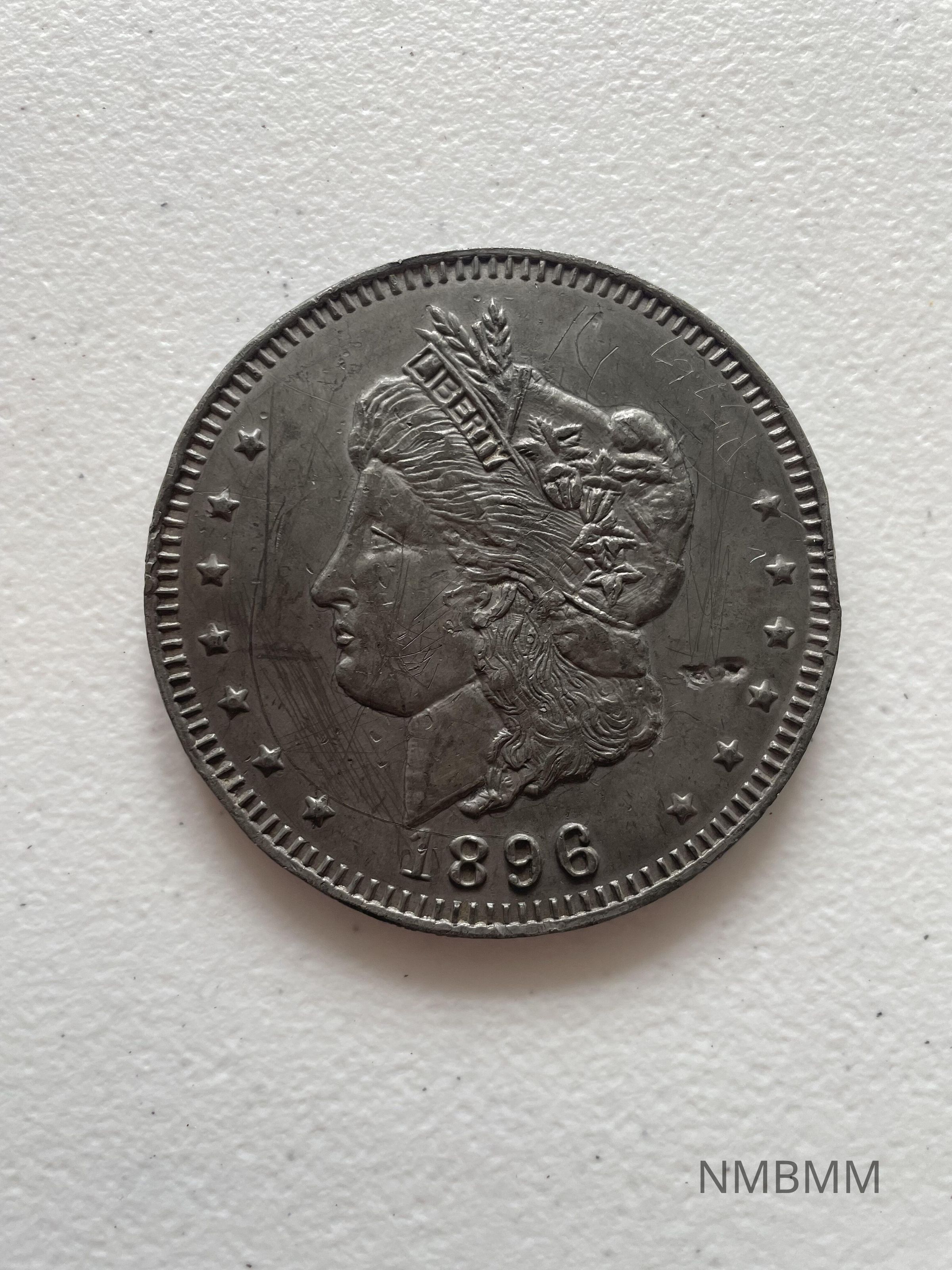 Silver dollar coin with liberty head on one side, "1896". Eagle on another side, "United States of America, 16 to 1 - NIT"Acquisition