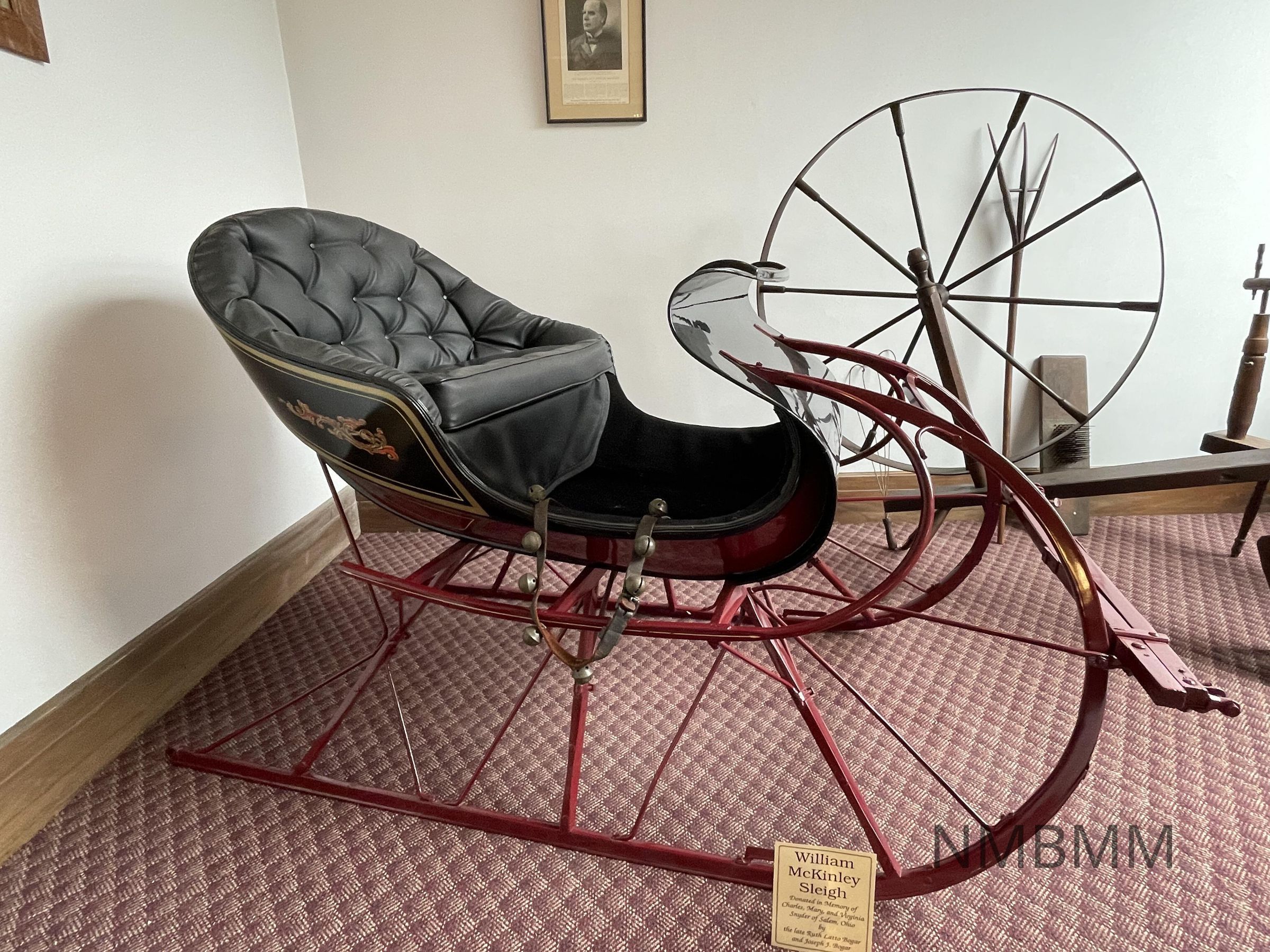Black and red horse-drawn sleigh belonging to William McKinley. There are bells attached to the front of it.