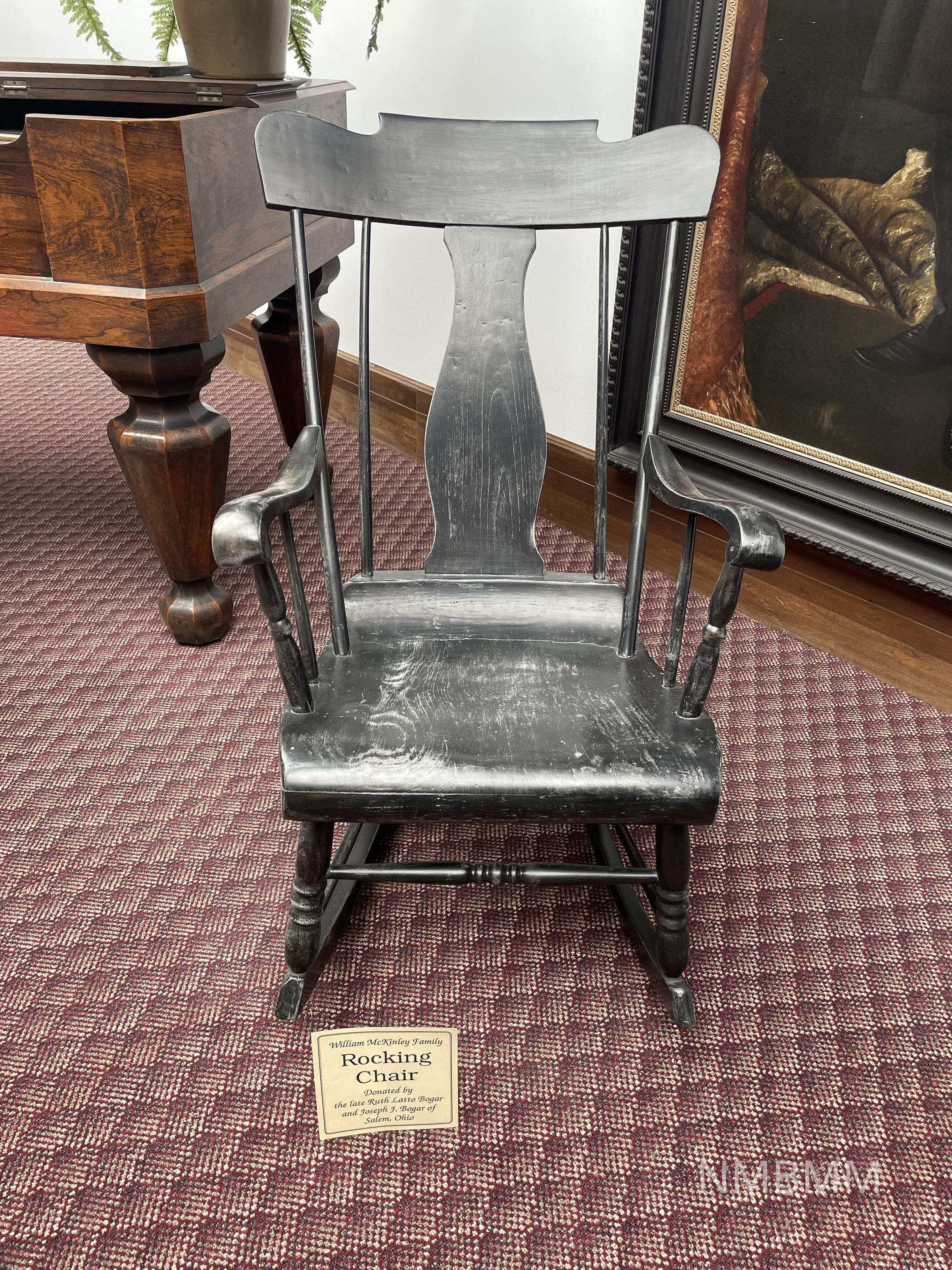 Black wooden rocking chair belonging to the McKinley family.
