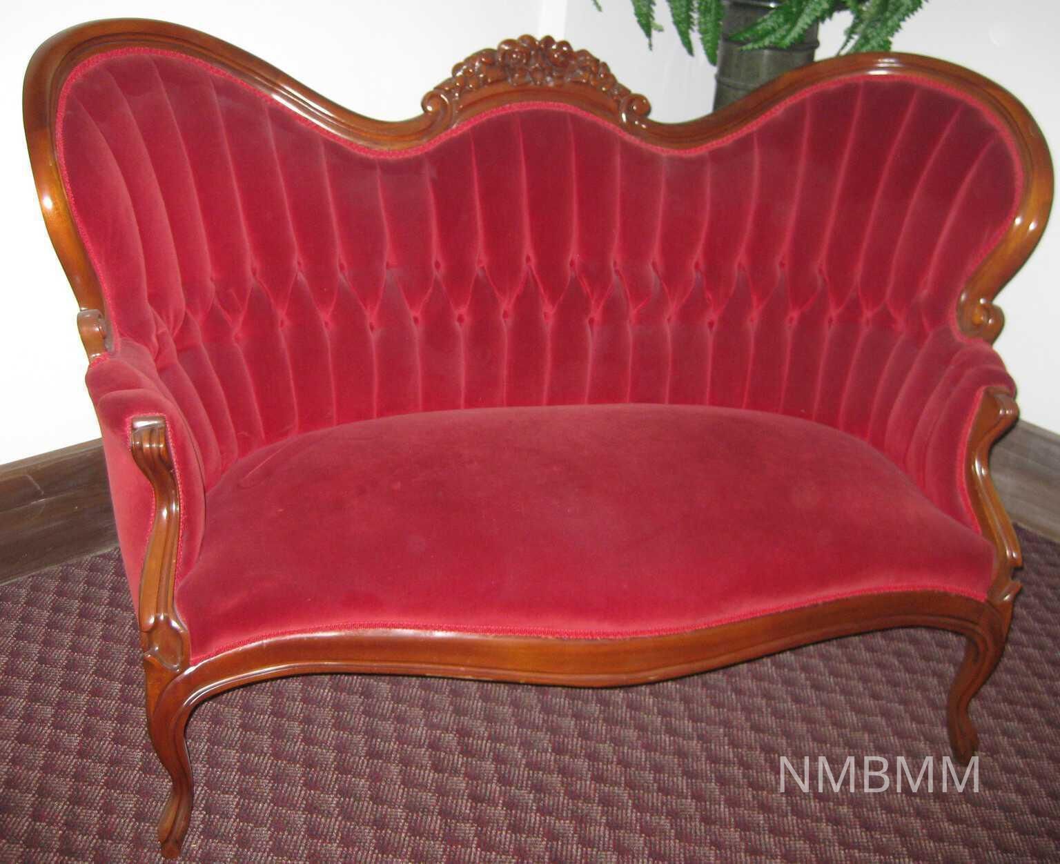 The item is a red velvet Victorian style love seat with a carved floral head piece made from a cherry wood.