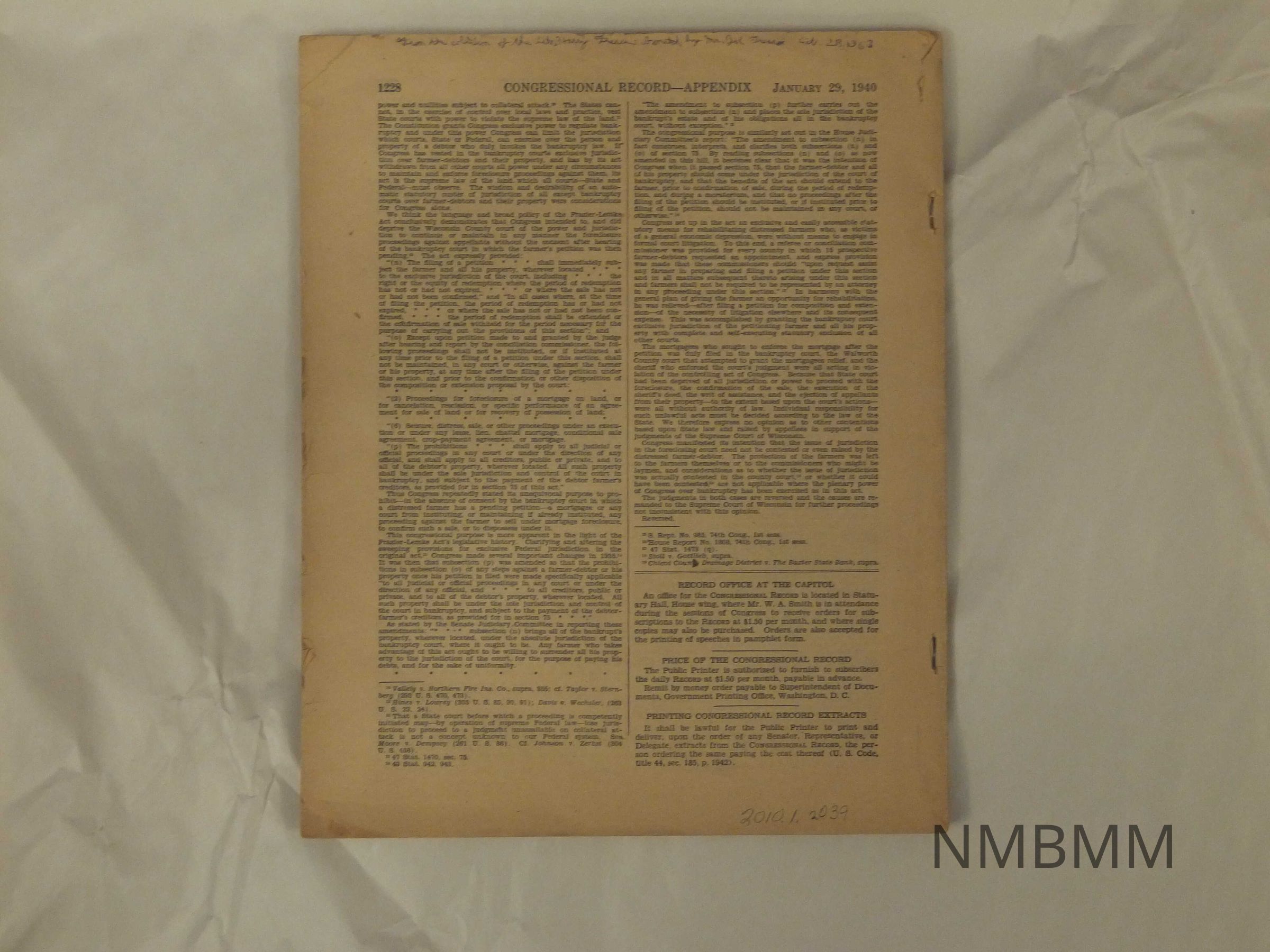 This book is the Congressional record for January 29, 1940. The book is softbound, with staples reinforcing the binding. It is printed on news print. A handwritten note at the top of the front page says there is an article about McKinley on pp 1158-1160. 9.25 x 11.25 inches
