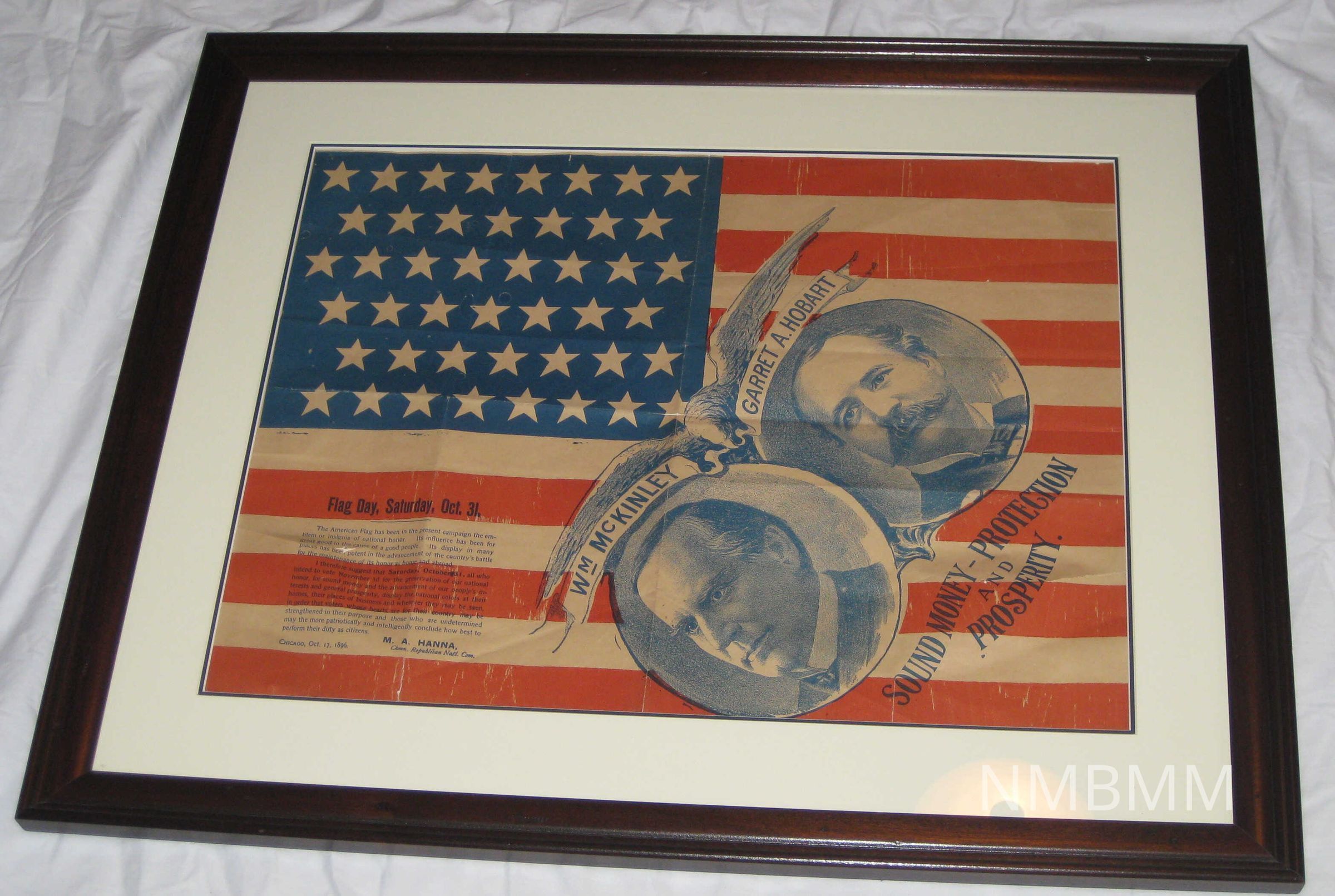 The item is a political banner of McKinley and Hobart written by M.A. Hanna, Chairman of the Republican National Party. Dated October 17, 1896 in Chicago. The banner has an American flag background and Flag Day- Saturday October 31 written on side.