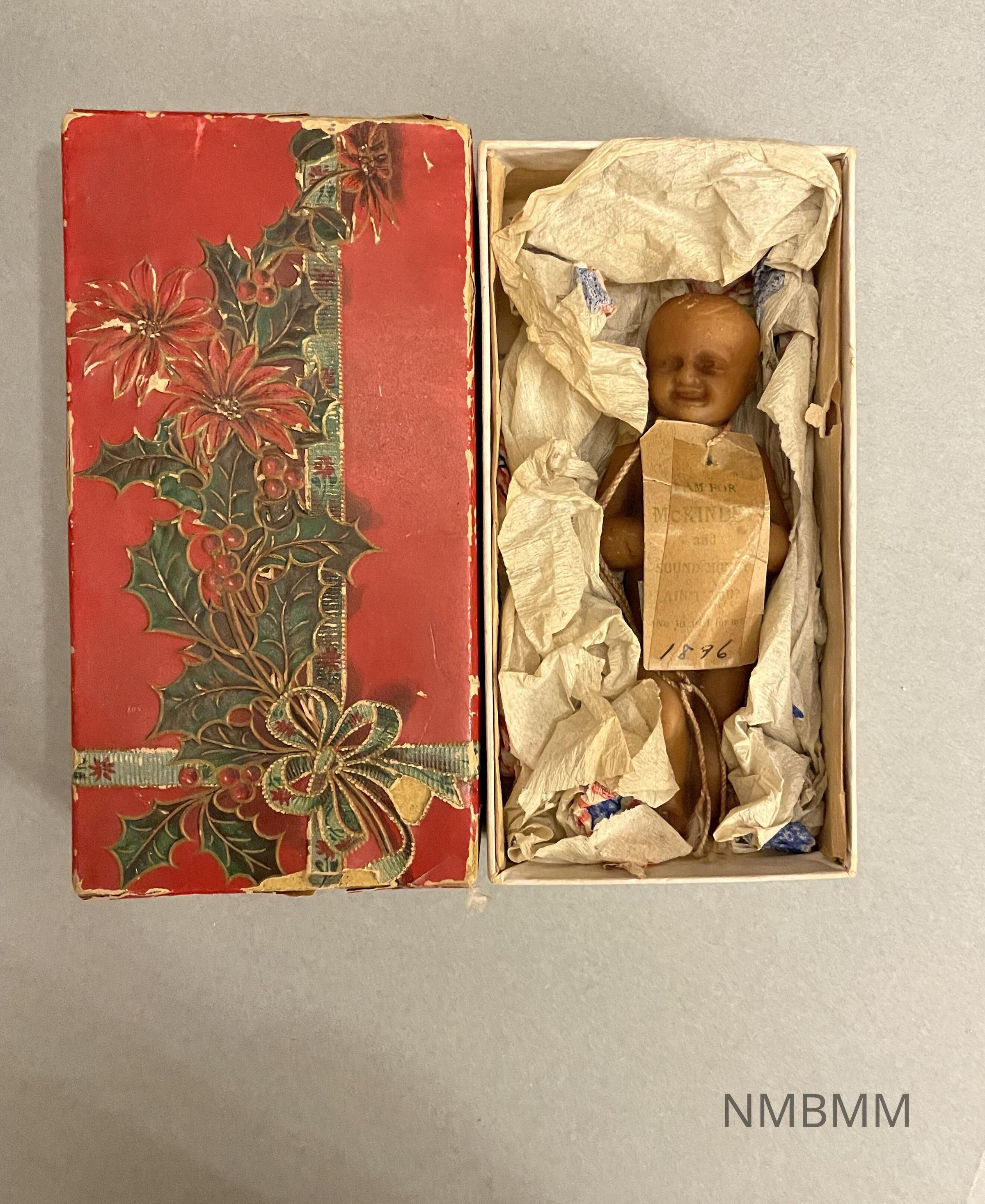 The "soap baby" was a piece of campaign memorabilia for the 1896 election. It is carrying a beige sign that says, "I am for McKinley and Sound Money aren't you?" On the sign, the year 1896 is listed. The "soap baby" is without clothing and is kept in a red box with paper stuffing.Acquisition