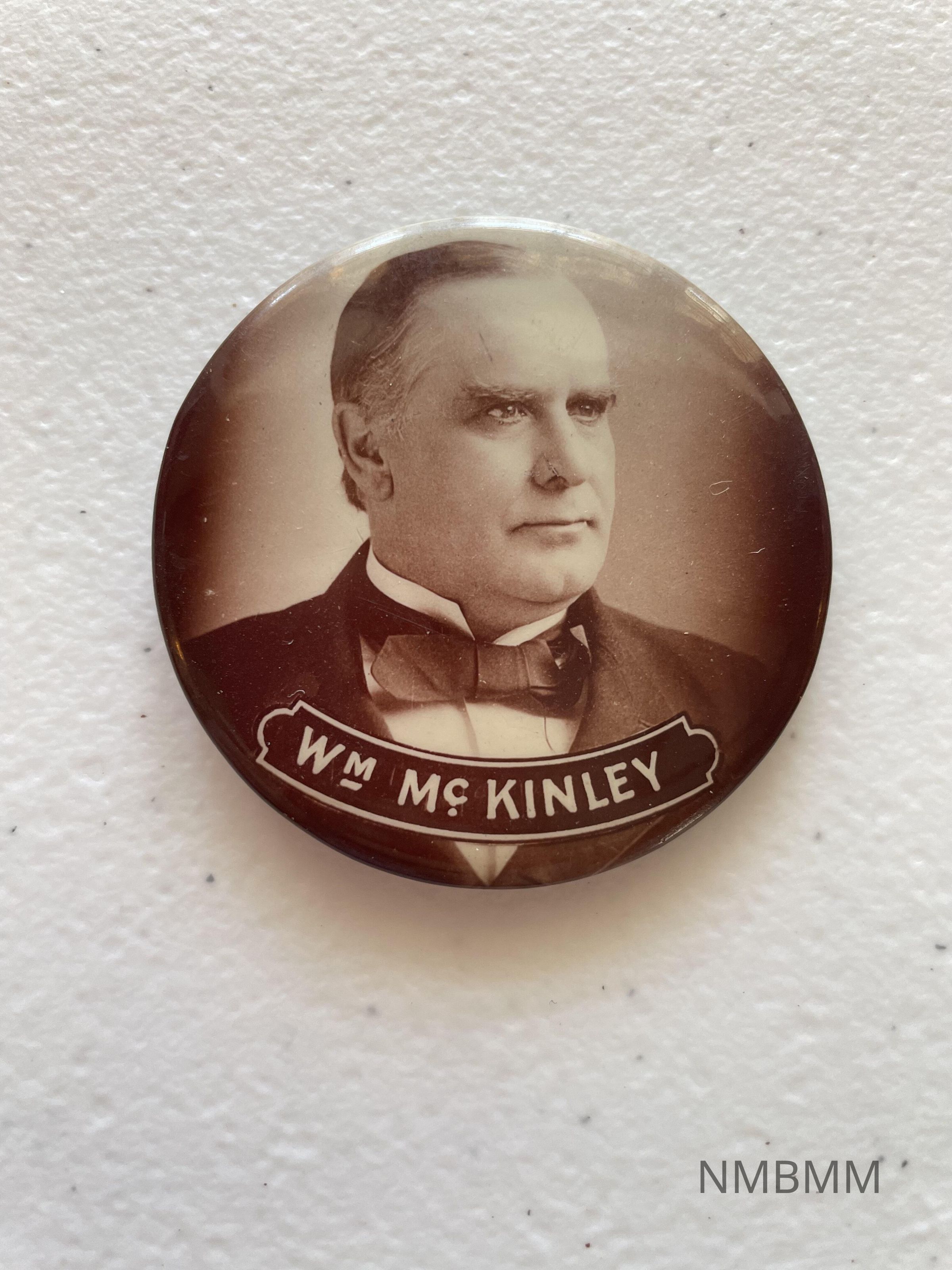 The item is a campaign pin from either the 1896 or 1900 elections. It features a picture of President McKinley and his name is below it.