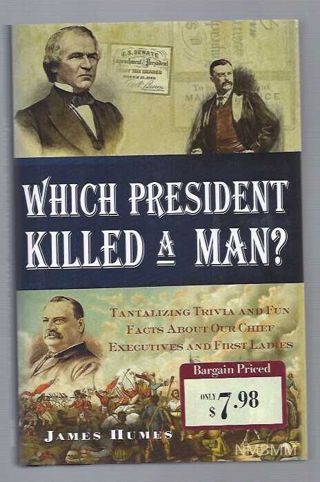Trivia about Presidents and First Ladies. Hardbound book has sepia cover with colored images of Andrew Johnson in the upper left corner, Theodore Roosevelt in the upper right corner, Grover Cleveland on the left and under the title, and a scene of war along the bottom. There is a sticker "Bargain Priced Only $7.98" on the lower right corner. The back features a synopsis of the book.