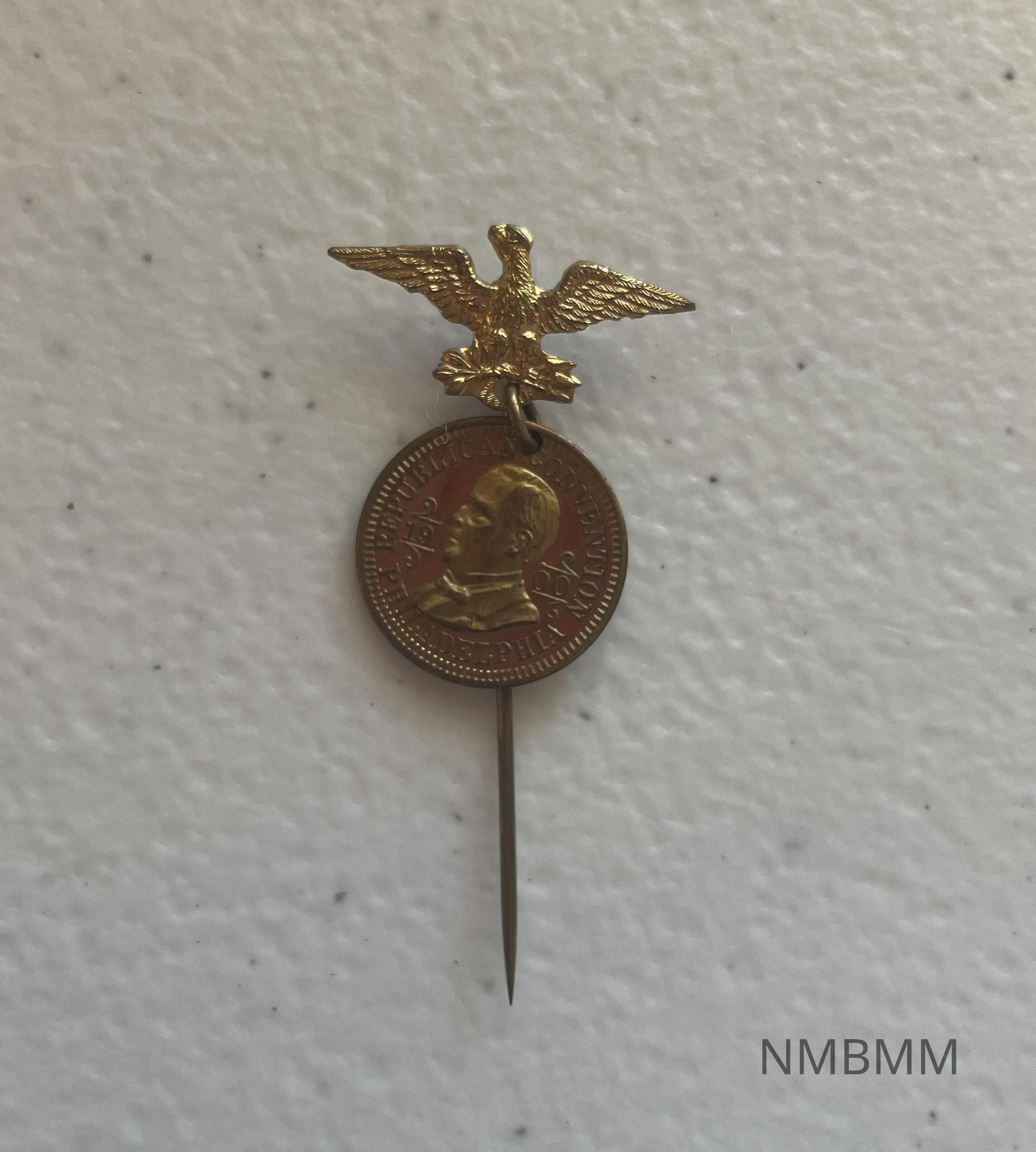 The item is a pin from a Republican Convention. It features an eagle sitting on top of a coin with an engraved picture of President McKinley and the words Republican Convention.Acquisition