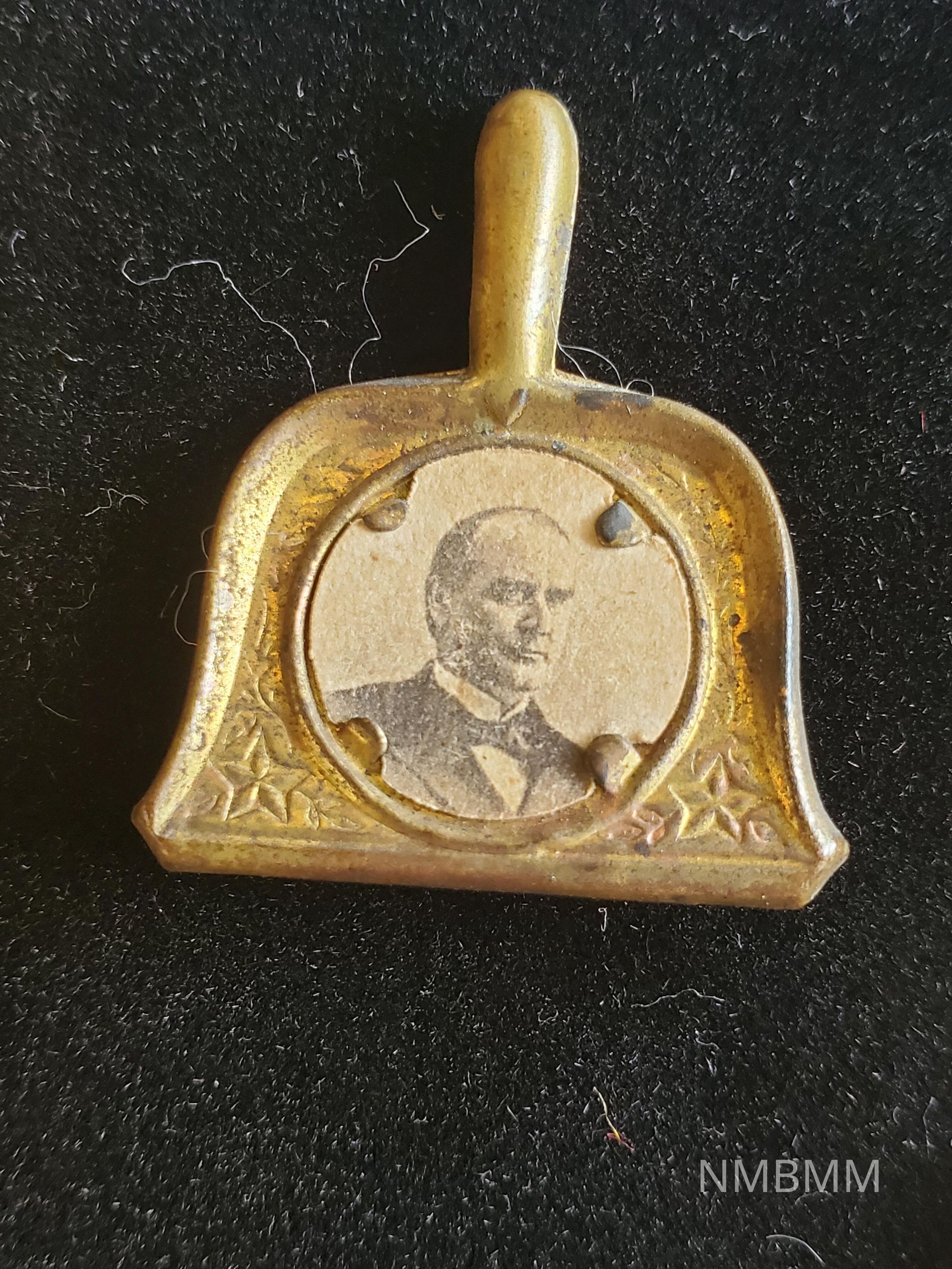 The item is a McKinley campaign pin from either the 1896 or 1900 elections. It is in the shape of a bell. It features a black and white picture of McKinley.Collection