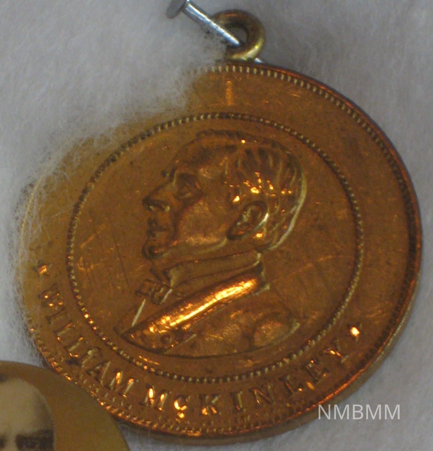 The item is a commeorative gold coin with an engraving of William McKinley's face and name. It is a piece of campaign memorabilia from either the 1896 or 1900 elections.Collection