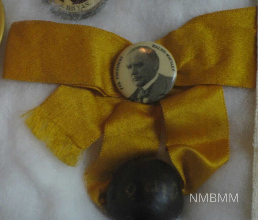 The item is a campaign ribbon and button with a black & white picture of William McKinley. It is a piece of campaign memorabilia from either the 1896 or 1900 elections. It features a yellow ribbon and buckeye. Button says "For President Maj. Wm. McKinley."Collection