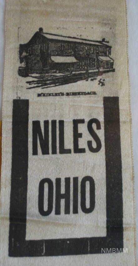 The item is a white satin ribbon featuring black lettering and a picture of McKinley's birthplace. It says, "McKinley's Birthplace Niles, Ohio."Collection