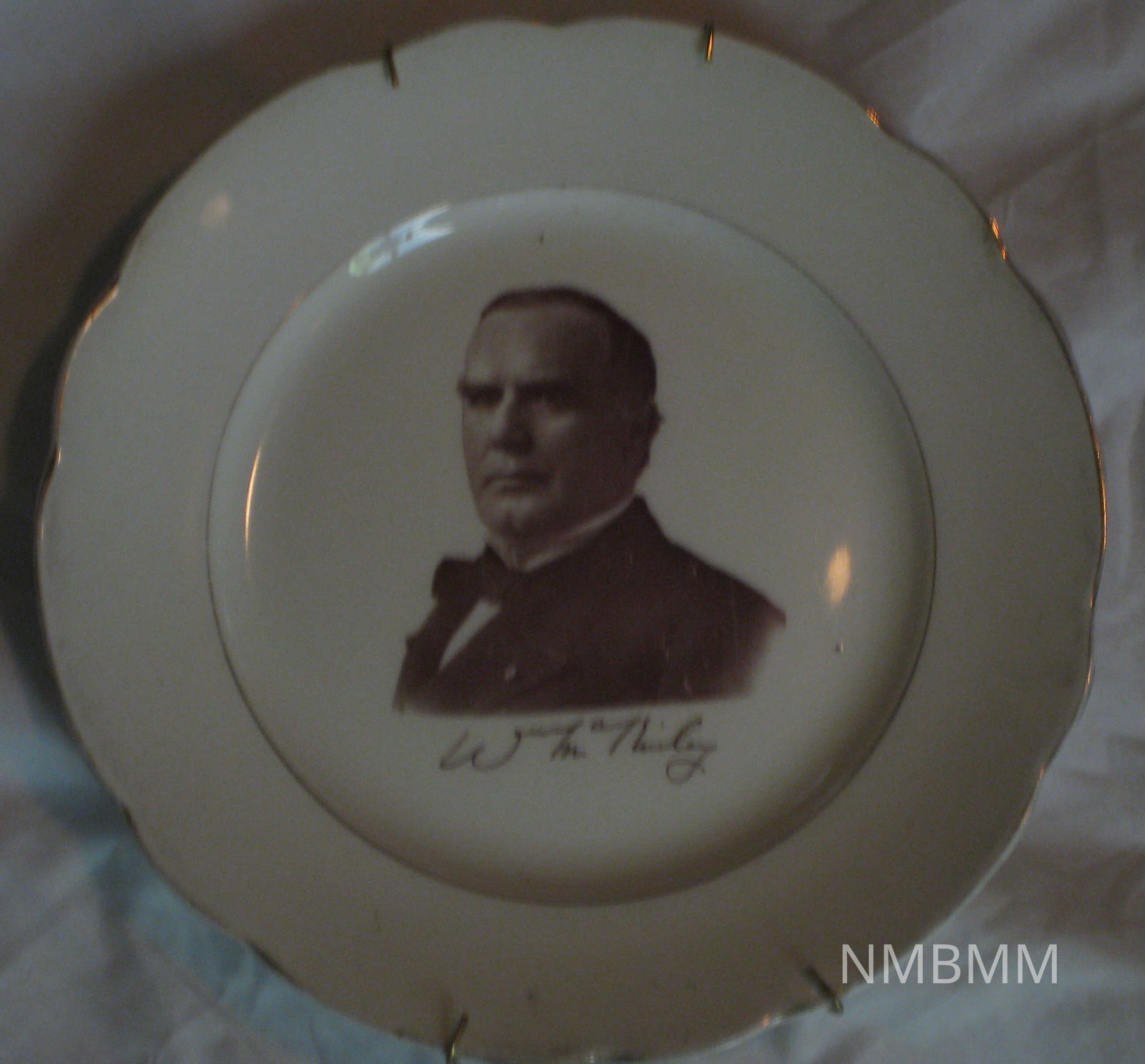 The item is a commemorative plate with a sepia toned picture of President William McKinley. The plate features the President's signature, gold trim, and slight scalloped edges. On the back of the plate, Jesse Dean from Trenton, N.J. is listed as the china decorator. There is also a stamp of John Maddock & Signs Ltd England.Collection
