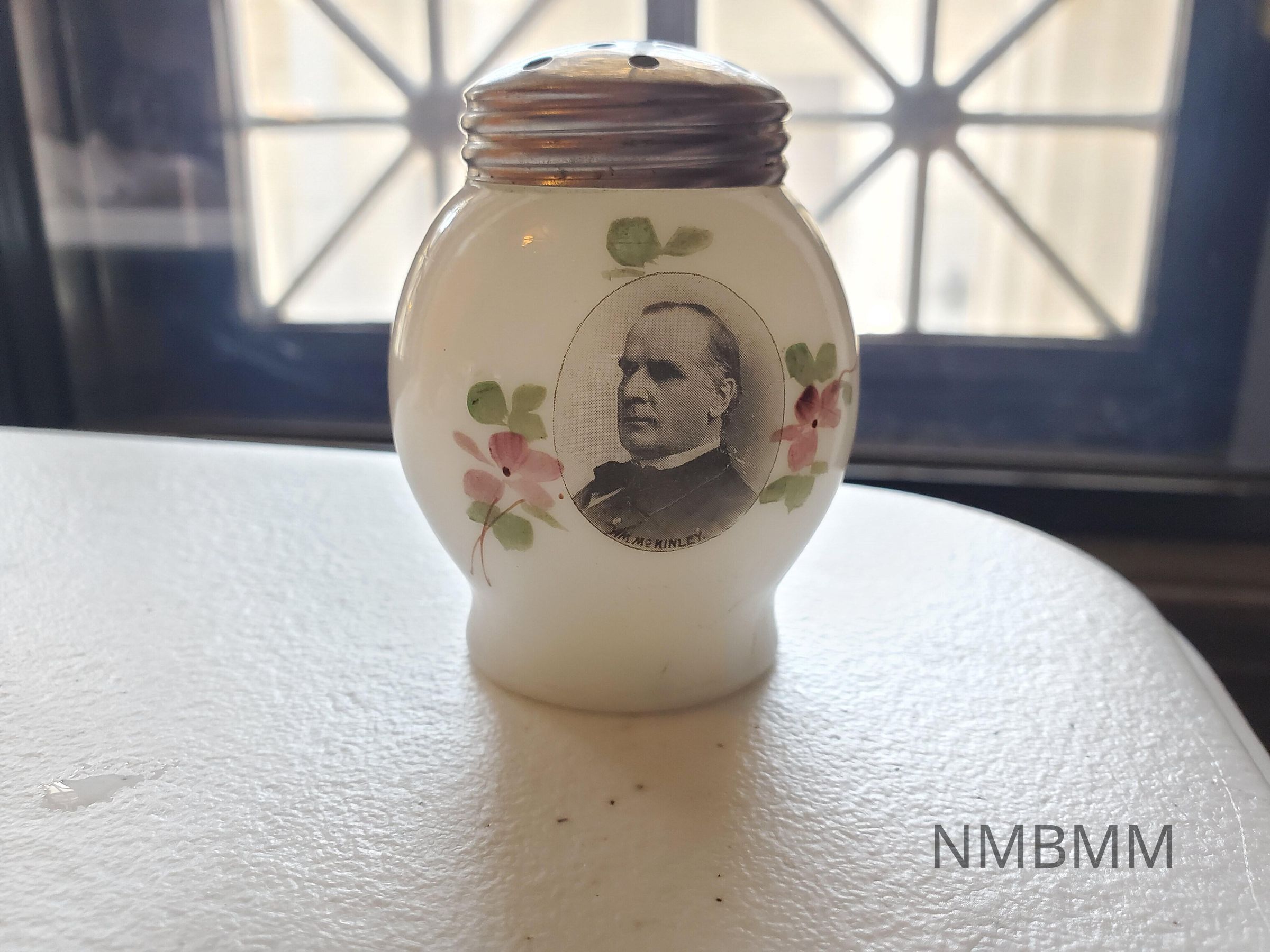 The item is a salt shaker featuring a picture of William McKinley surrounded by flowers. The salt shaker is glass with a metal top with very large holes. It is a part of a set. The pepper shaker features a picture of William Jennings Bryan.Acquisition