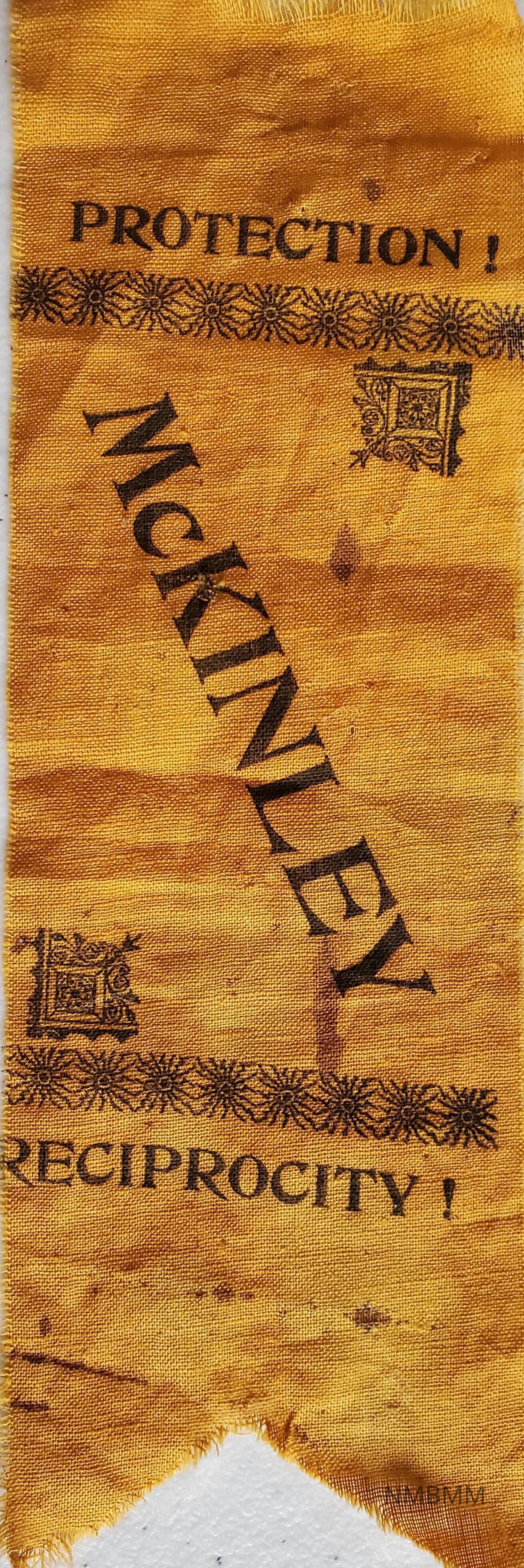 The item is an orange campaign ribbon that says, "Protection! McKinley Reciprocity!" The ribbon features some decorative graphics.