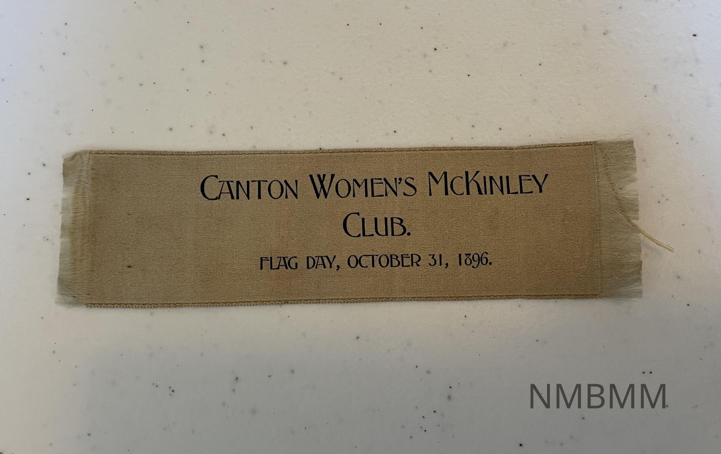 The item is a silver ribbon that says, "Canton Women's McKinley Club. Flag Day, October 31, 1896."