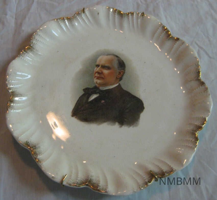 The item is a commemorative plate with a colored picture of President William McKinley in the center. The plate features scalloped edges with gold accents. It was made in Canton.