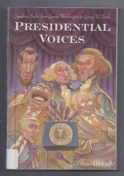 Examines the speaking styles of the US Presidents from George Washington to George W. Bush. Paperback book. The front cover features caricatures of Lincoln, Washington, Jefferson, T. Roosevelt, Truman, and George W. Bush gathered around a microphone. The back cover features a blue background with a synopsis of the book and several book reviews printed in white.