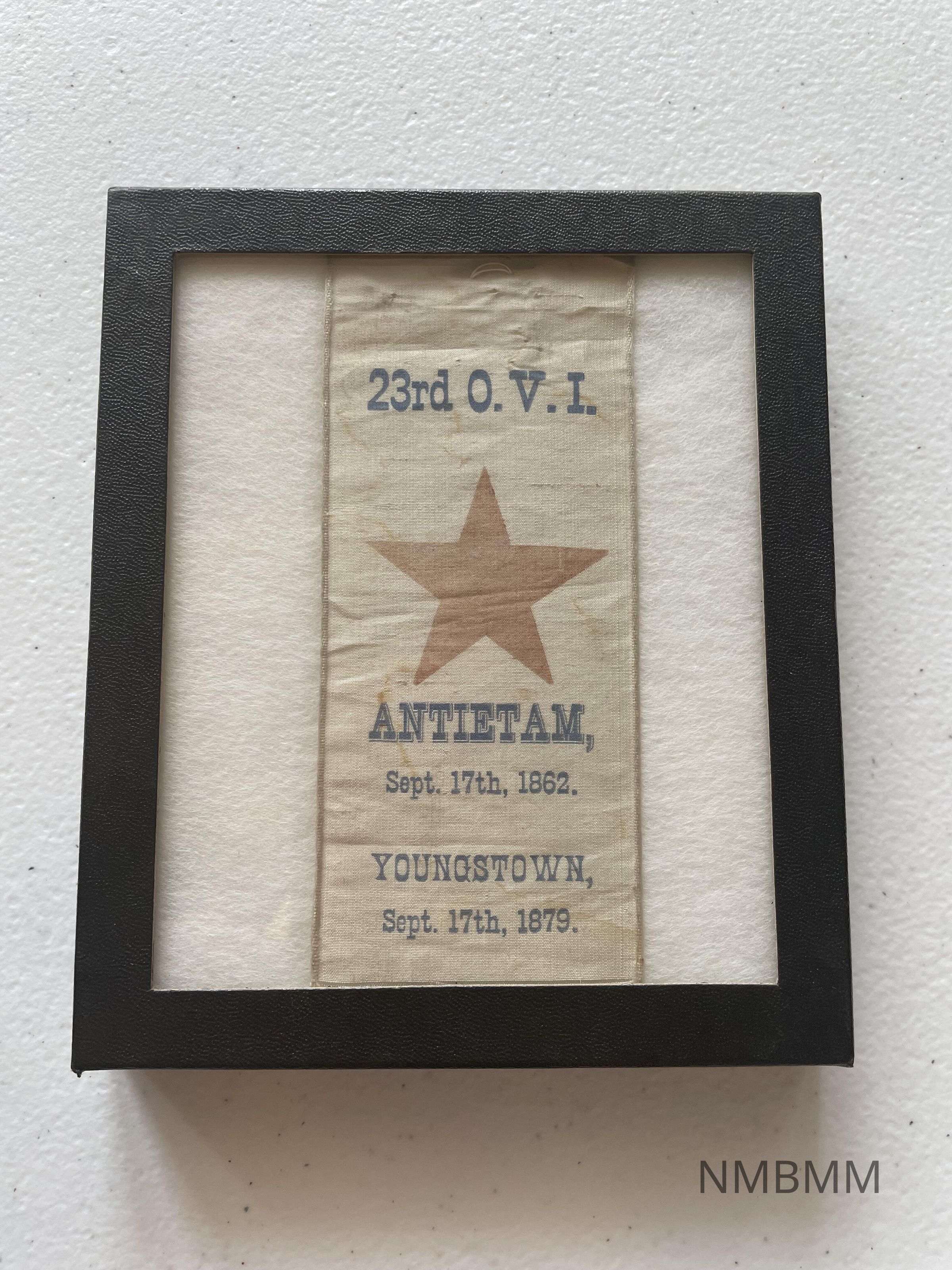 Ribbon reading, "23rd O.V.I. Antietam, Sept. 17th, 1862. Youngstown, Sept. 17th, 1879." The item is a commemorative ribbon in honor of the 17th anniversary of Antietam for the 23rd Ohio Volunteer Infantry.Acquisition