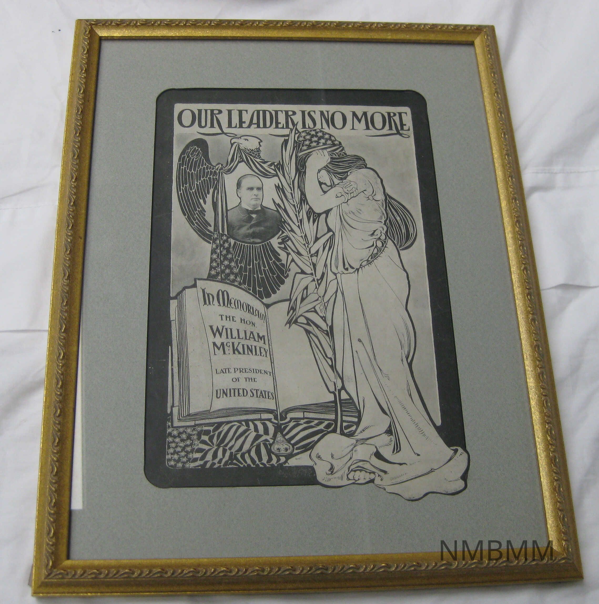 The item is a memorial print for President William McKinley. The print is black and white and features gray matting and a gold frame. It is titled, "Our Leader is No More." The print shows a picture of President McKinley on the stomach of a bald eagle who is draping an American flag from its mouth. It also shows a visibly upset "Lady Liberty" type character who is holding a feather pen and appears to have written in a book the words, "In Memoriam The Hon. William McKinley Late President of the United States."