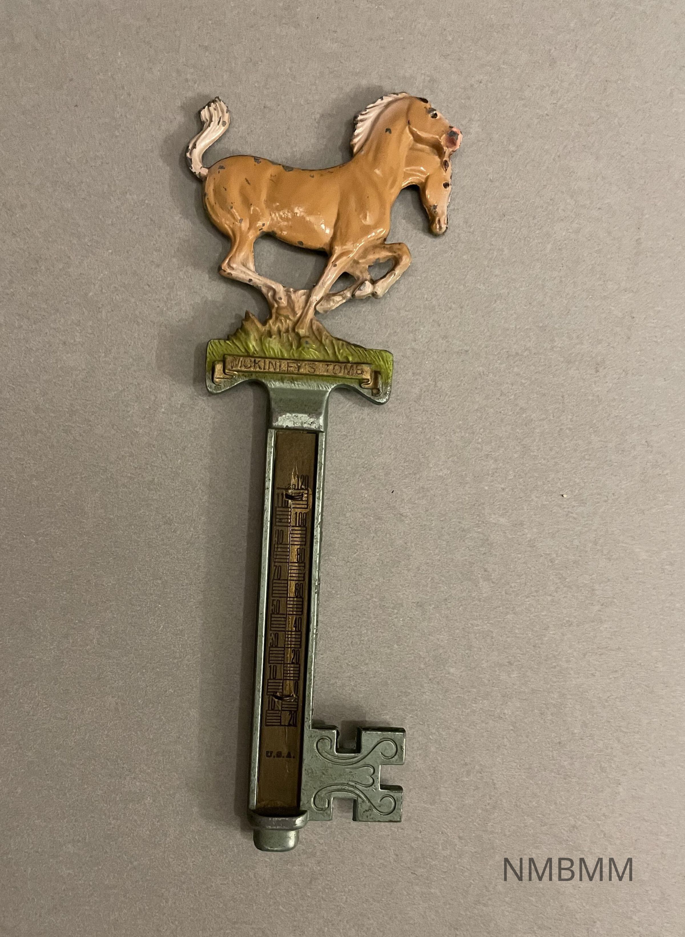 The item is a thermometer that looks like a key with horses on top. The thermometer has degree markings on the front. The two headed horse is brown and on green grass standing on the words, "McKinley's Tomb." The back side is completely green.Acquisition