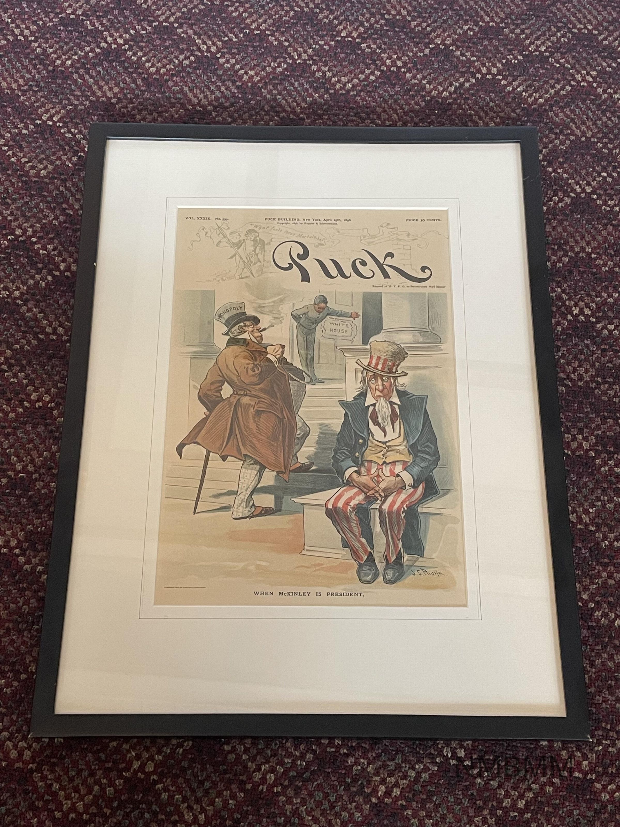 A framed front cover of the publication, Puck from 1896.