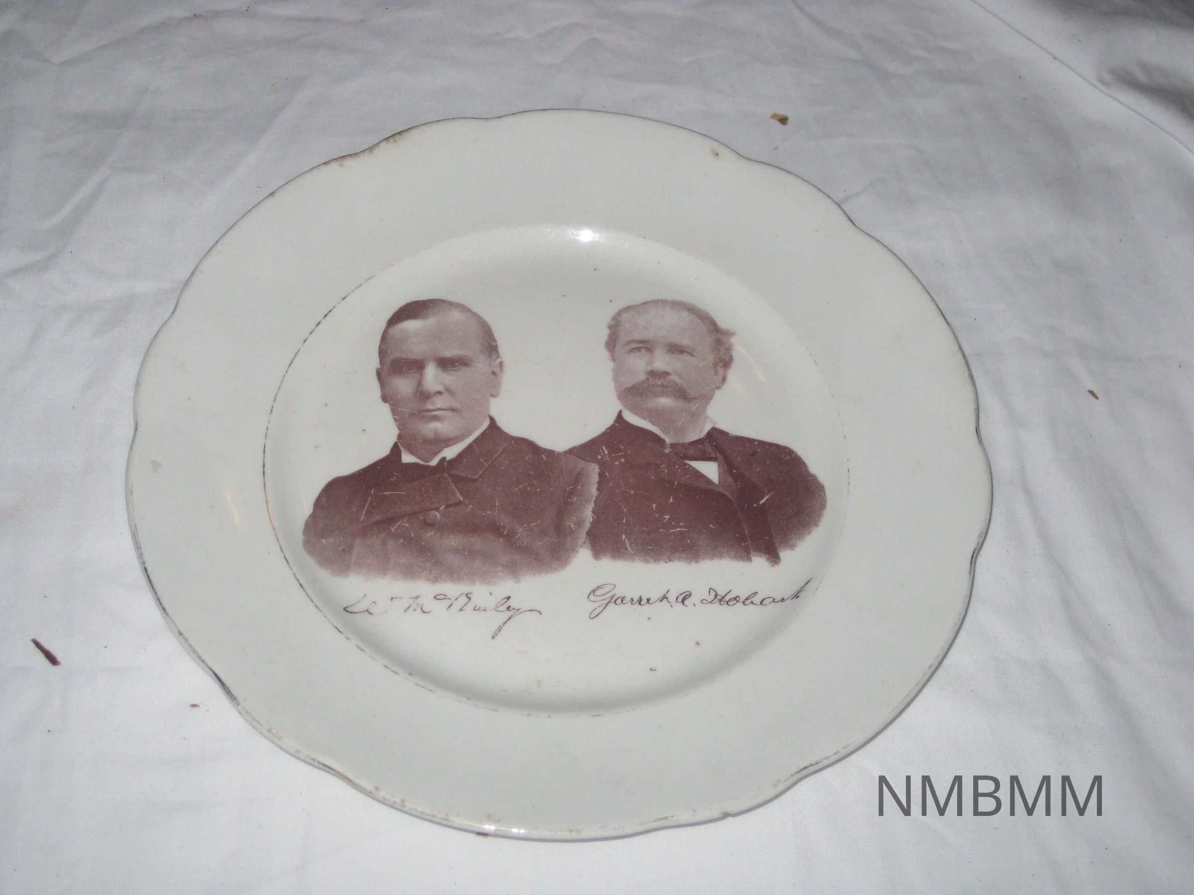 The item is a commemorative plate of William McKinley and Garrett Hobart. The item features sepia toned portraits of McKinley and Hobart with their signatures underneath. The plate has gold trim around the scalloped edges. The item features a maker's stamp on the back of the plate for John Maddock & Sons Ltd. Royal Vitreous England. The plate was designed by china decorator Jesse Dean in Trenton, N.J.