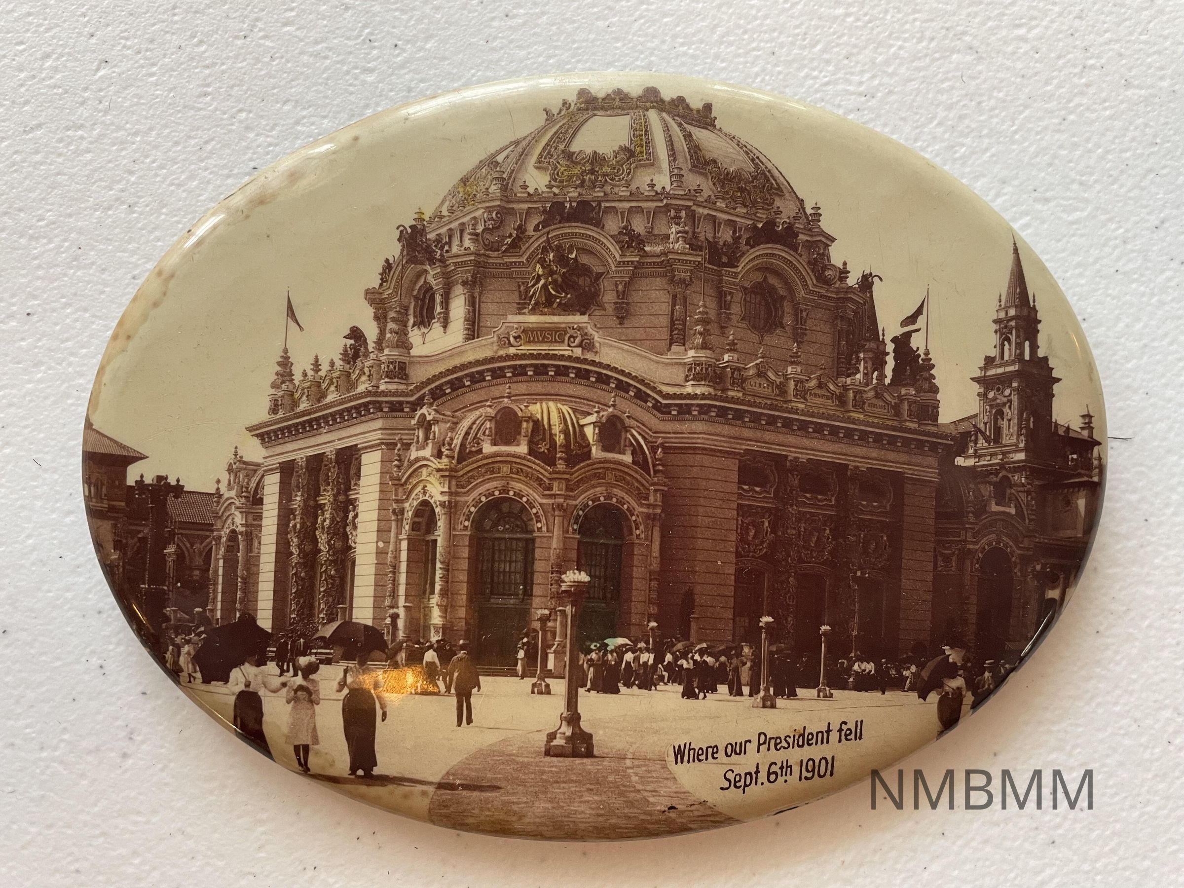 A wall hanging of the Temple of Music at the Pan American Exposition. It features the text, "Where our President fell Sept. 6th. 1901"