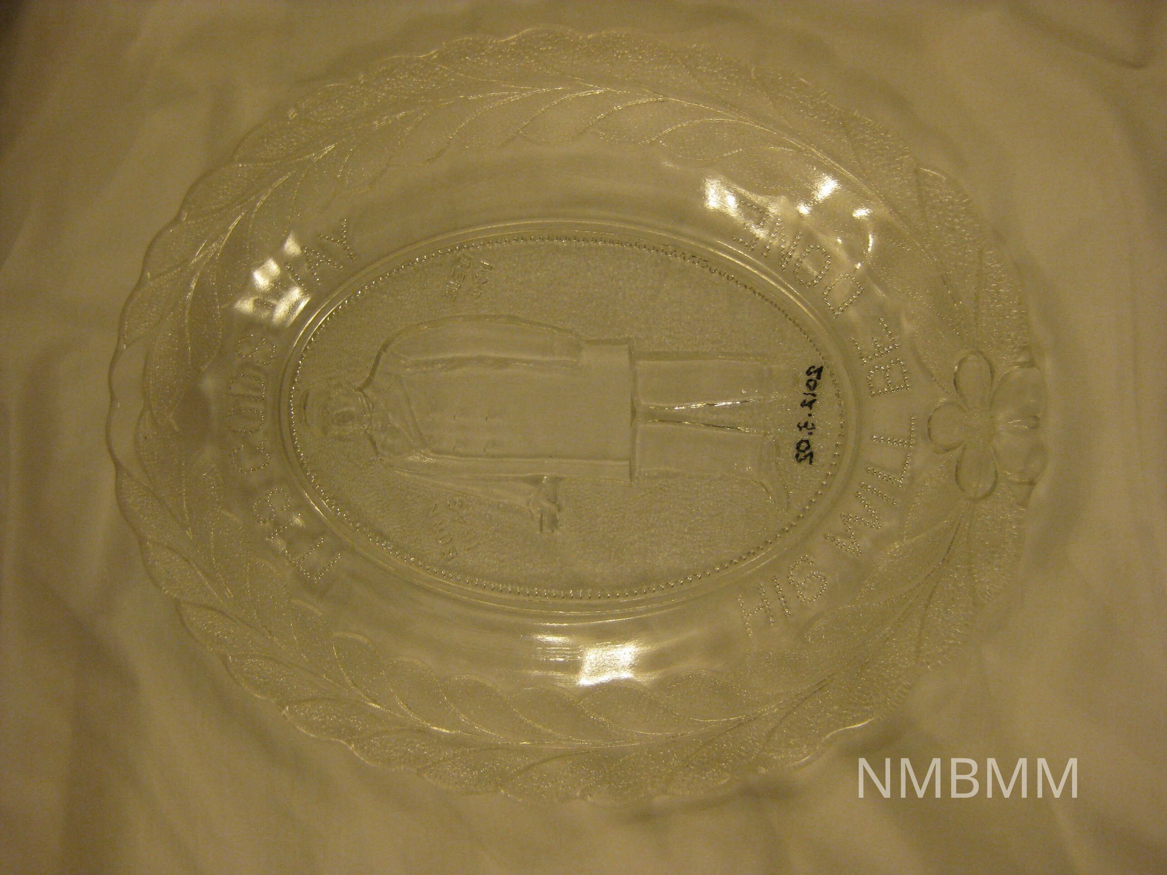 The item is a glass commemorative engraved plate of the life of President McKinley. It features the text, "It Is Gods Way His Will Be Done Born 1843 Died 1901". The engraving has President McKinley in the center with the text and olive branches on the outside. 10.5 x 8 inches.Collection