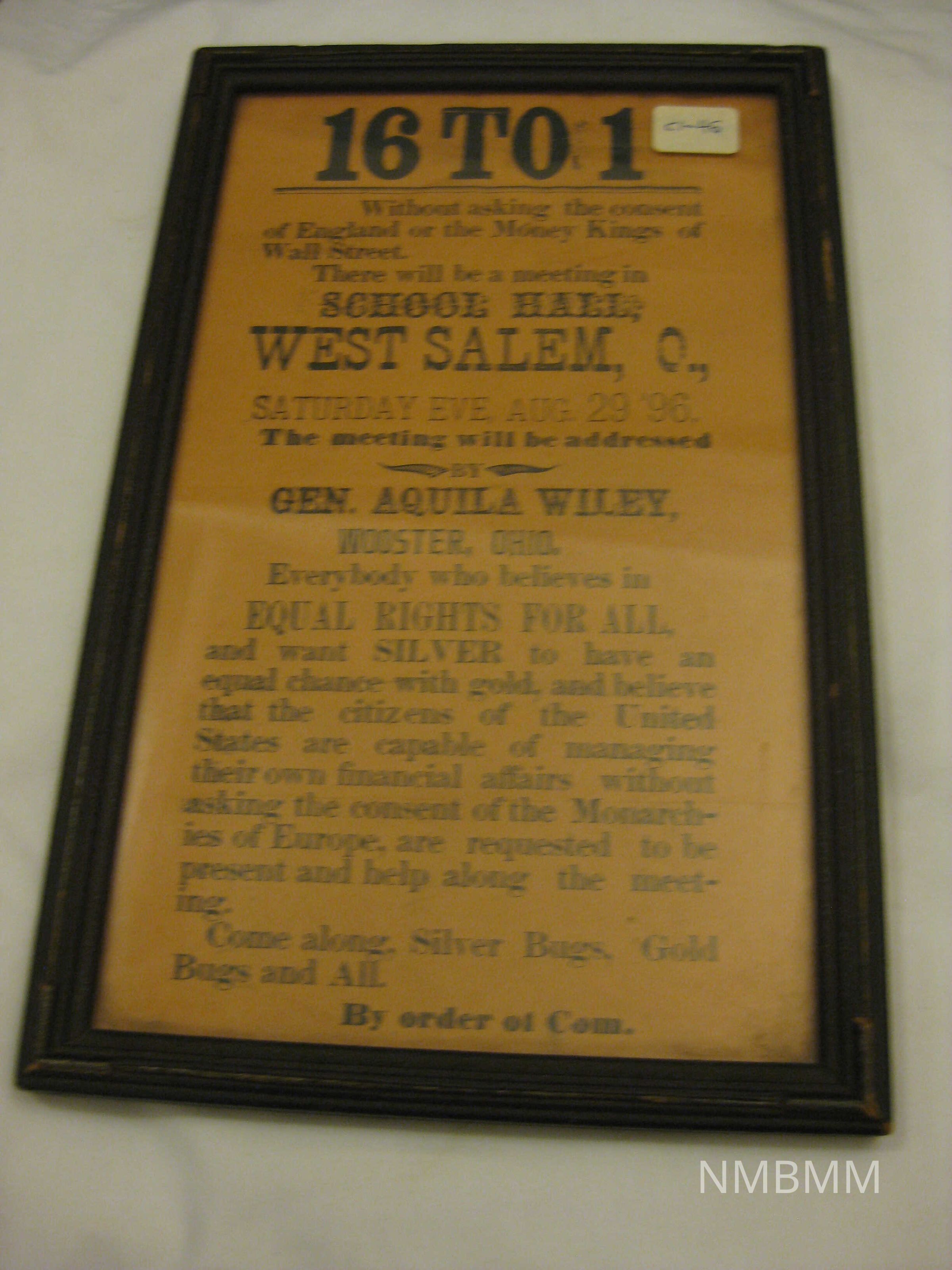The item is an advertisement for a "16 to 1" meeting to discuss the issue of the gold and silver standards. The meeting was held in West Salem, OH, The meeting was addressed by General Aquila Wiley.Collection