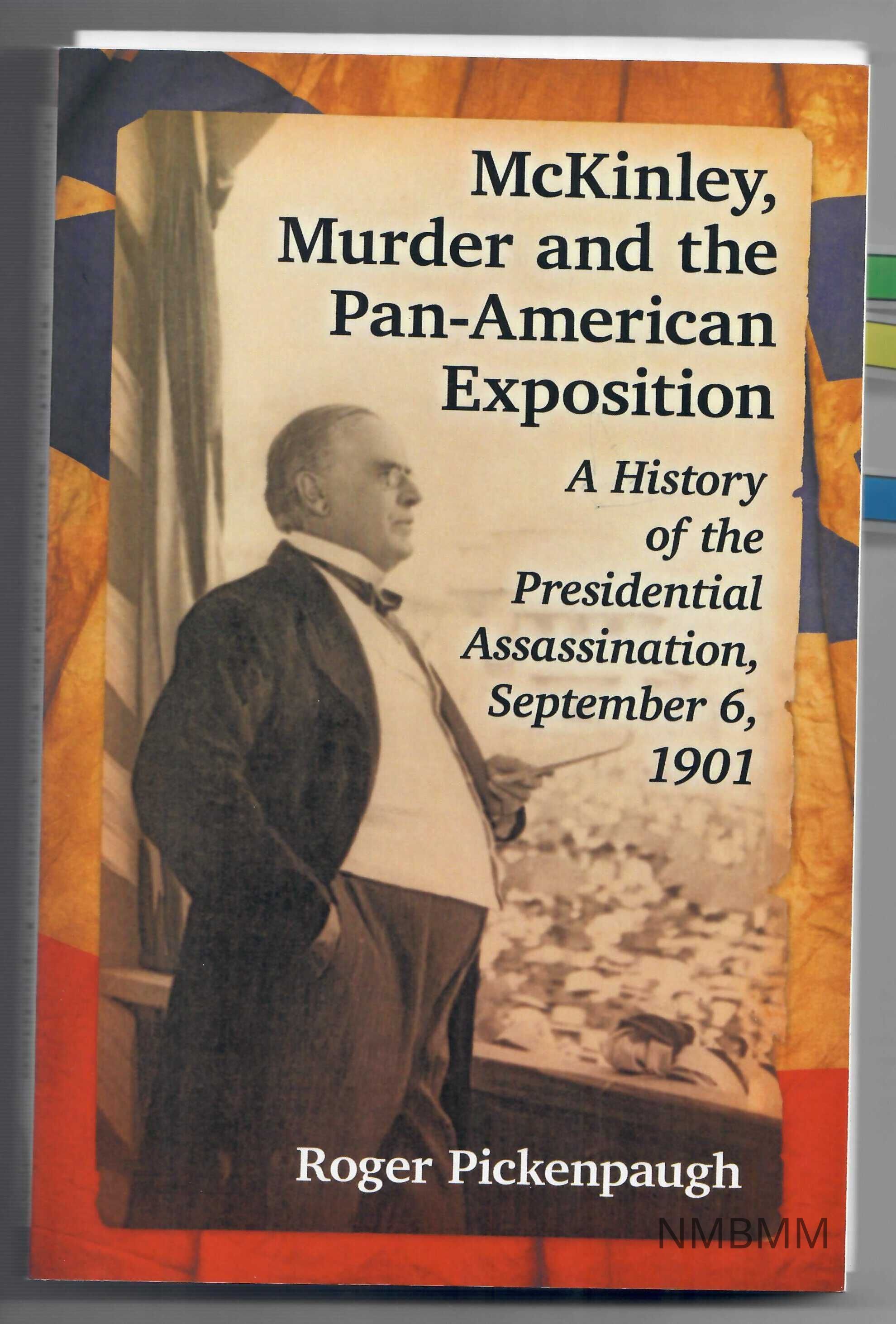 Paper back book. The front cover features a photo of McKinley making his last speech at Buffalo, New York on September 5, 1901. The background features an orange, blue, and red design. The title is near the upper right corner, in bold black letters, with the subtitle directly underneath in italicized black letters. The author's name is in white letters at the bottom. The back has the same background as the front, with a sepia-toned overlay. It features a brief synopsis of the book, as well as a brief biography of the author. The bottom gives the publisher's name. The book's bar code and ISBN are in a white rectangle near the bottom. There is a small price sticker over the bar code. The caption for the front cover is next to the bar code in black letters: "Front cover: William McKinley delivering his last address, Buffalo, New York, September 5, 1901. (Library of Congress)."Collection
