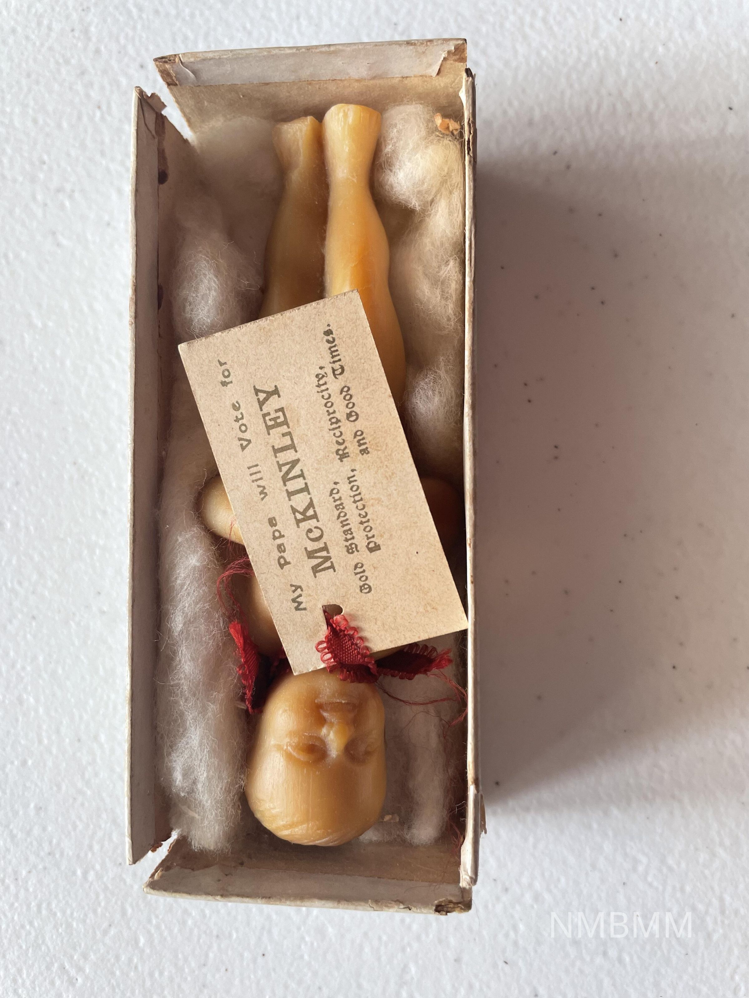 A bar of soap fashioned into the shape of a baby, with a tag around its neck that says "My Papa will Vote for McKinley: Gold Standard, Protection Reciprocity and Good Times."Collection