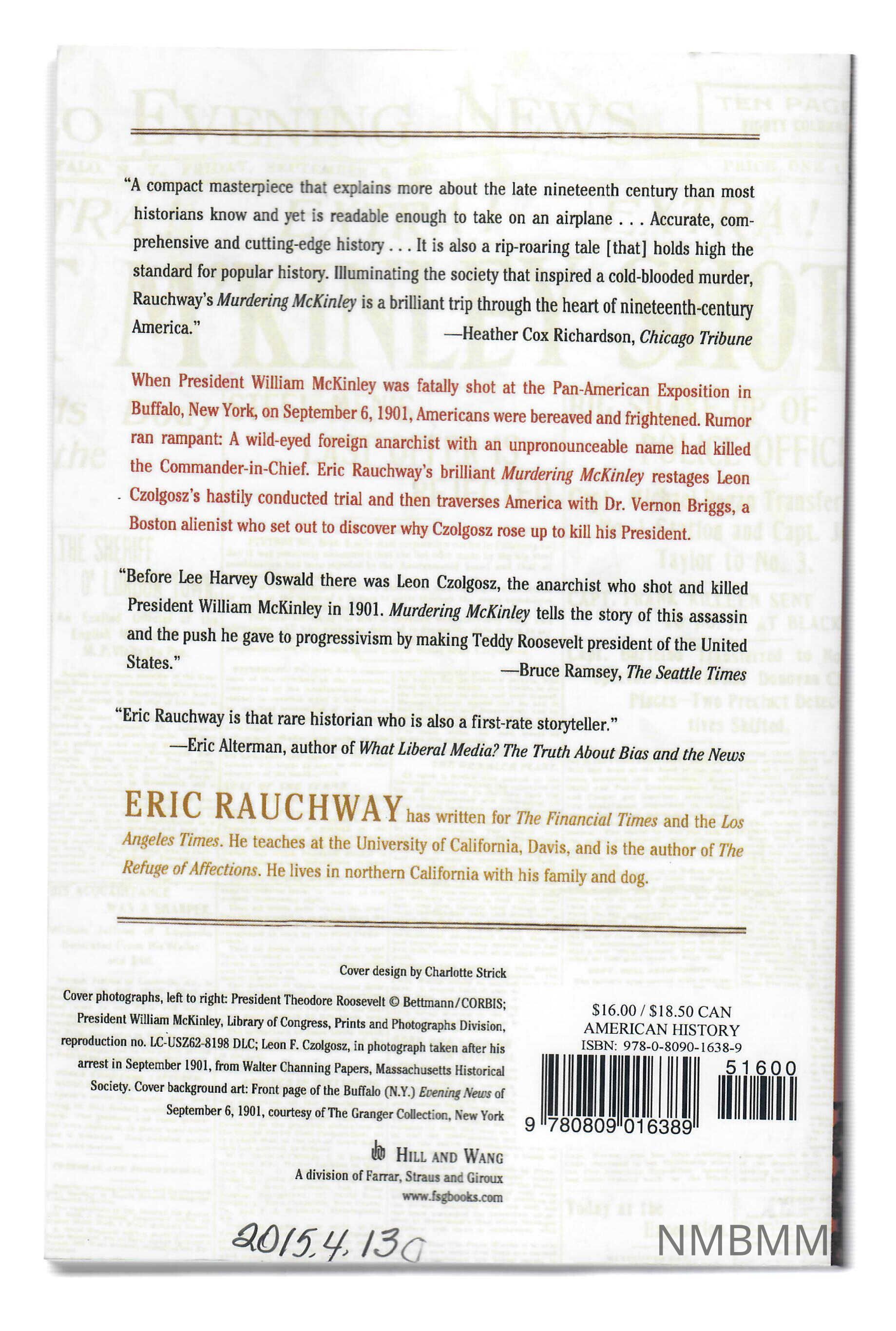 This paperback book is white. It features a line of Bob Hoover's critique in sepia-toned lettering across the top. The title is superimposed over four brown and three white stripes. The subtitle is in brown letters beneath the title. the author''s name is in light brown letters beneath the subtitle. A sepia-toned image of William McKinley is superimposed over sepia-toned images of Theodore Roosevelt at left and Leon Czgolosz at right, on the bottom. The back features excerpts of four reviews, as well as a brief biography of the author in brown letters on a white background. The bottom contains information about the photos on the front, as well as the publisher's information. The book's bar code, price, and ISBN are on the right.Collection