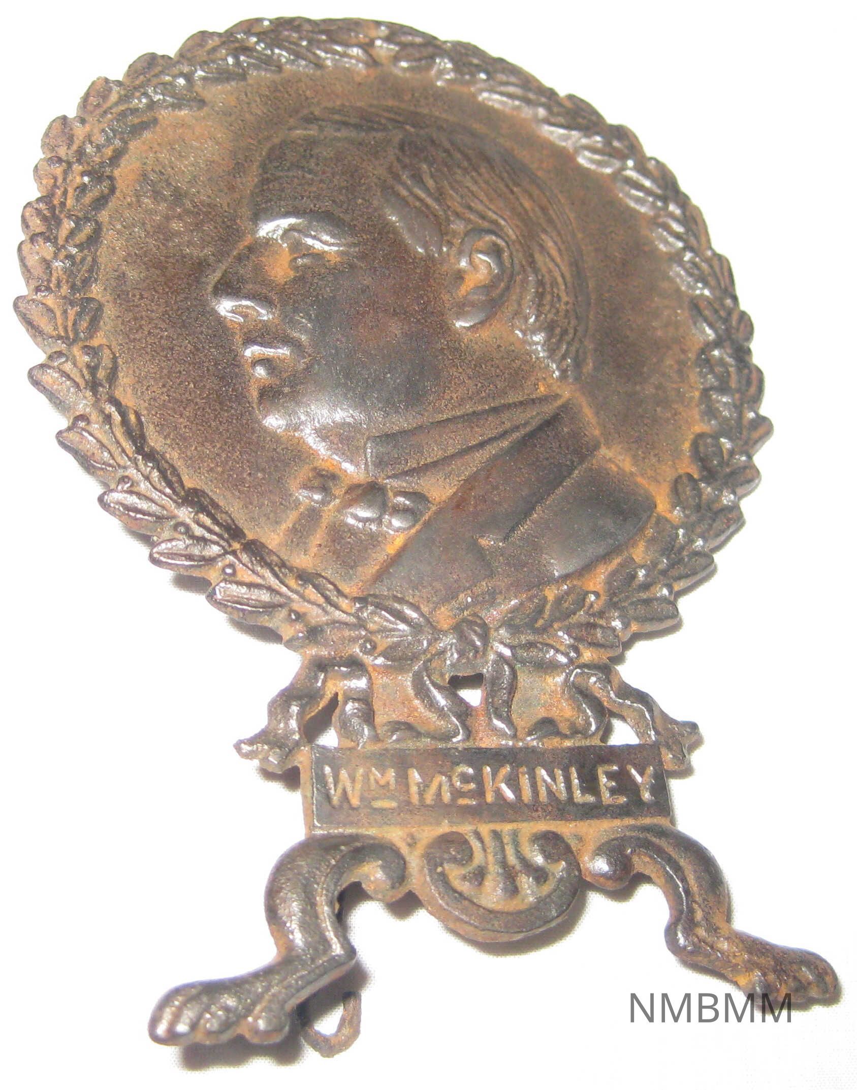 The item is an engraved McKinley likeness made of bronze with decorative legs. The item features a side profile of McKinley in a circle bordered by olive branches. Below the likeness, his name is engraved. 3.75 x 3.5 inches. It could be campaign memorabilia or assasination memorabilia.Collection