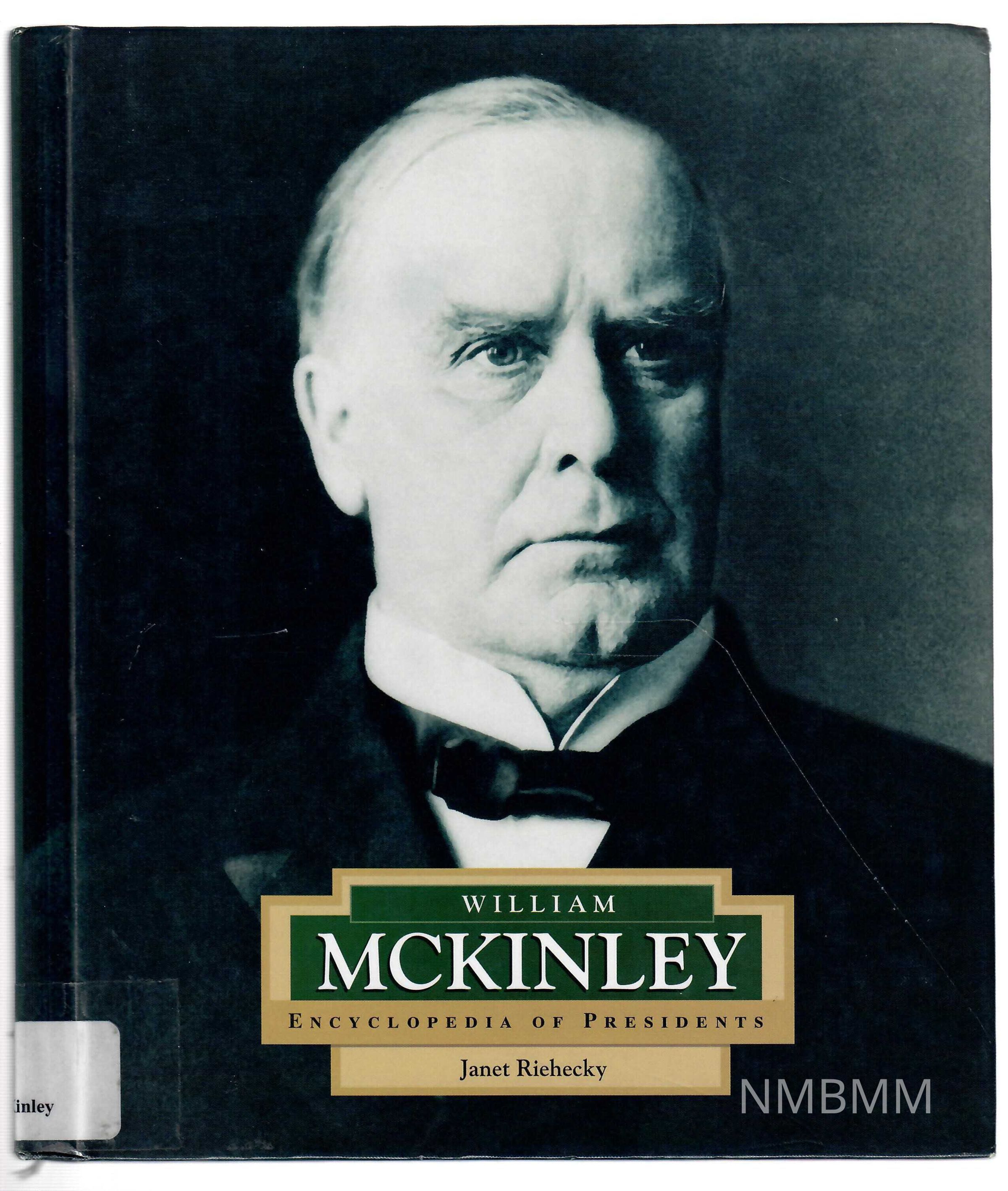 This hardbound book features a black and white photo of William McKinley on the front cover. The title is near the bottom, in a gold keystone shape, with the title in white lettering on a green background. The back cover features a green-toned photo of William McKinley standing in the President's office on the right. The left of the cover features a brief synopsis of the "Encyclopedia of Presidents" series in white and gold letters above a brief synopsis of the book itself. The publisher's name appears in white lettering on a red back ground next to a book icon near the lower left corner. The words "Children's Press Reinforce Binding" is is white letters near the bottom center. The book's bar code and ISBN are in a small white square near the lower right corner. A sticker that reads "McKinley Memorial Library" along with the library's bar code is vertical and to the right of the original bar code.Collection