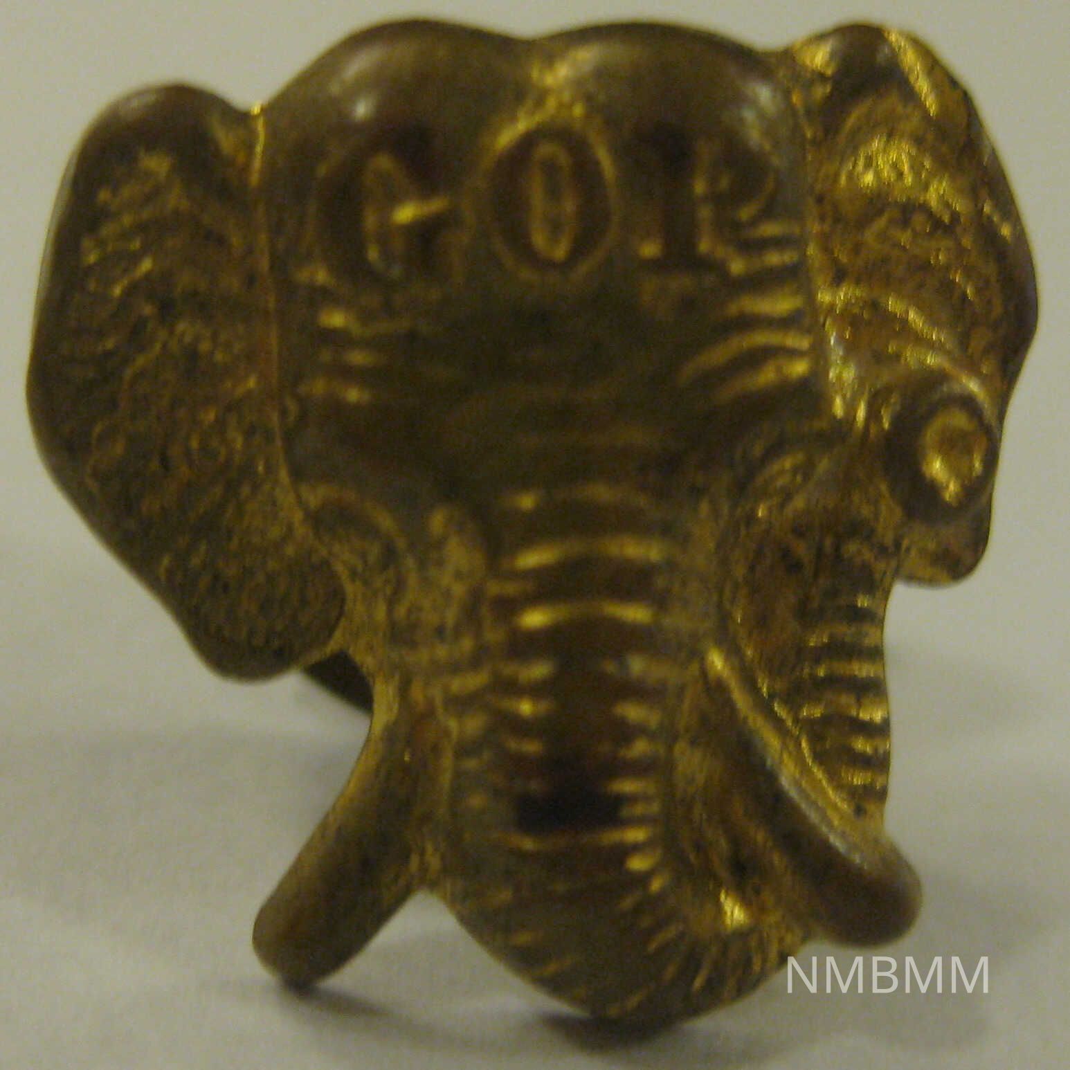 The item is a gold GOP elephant button. The initials "GOP" are engraved on the elephant's forehead. The item is 1/2 inches in diameter. The backside is a button back made to slide into the button holes of clothing.Collection