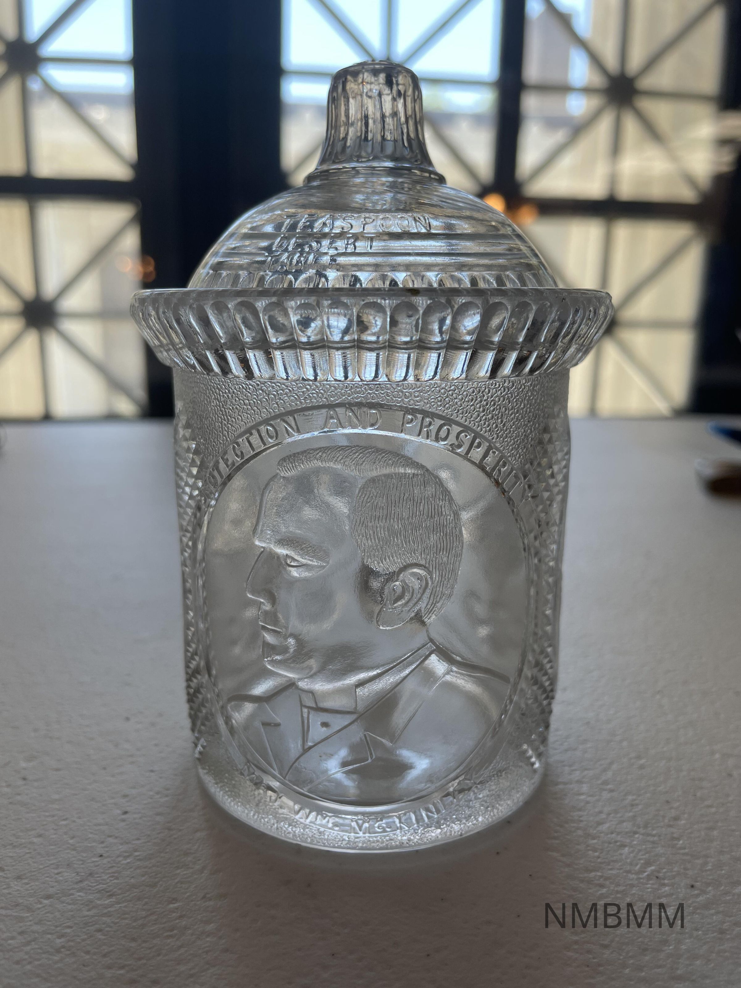 The item is a William McKinley glass cup. An image of President McKinley is engraved with the text, "Protection and Prosperity Maj. Wm McKinley."Acquisition