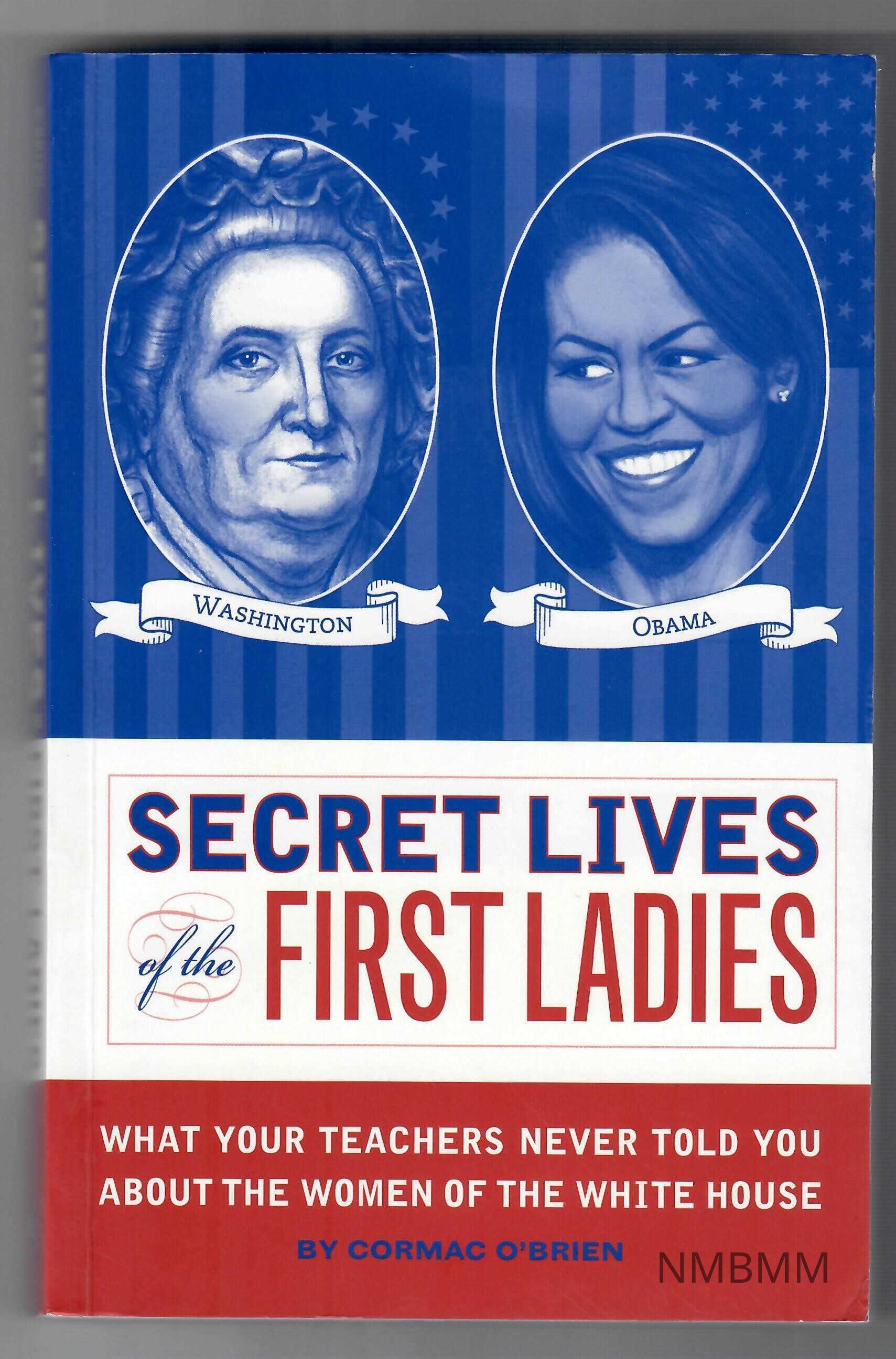 The front of this paperback book is red, white, and blue. The top of the front cover features caricature images of Martha Washington on the left and Michelle Obama on the right, in blue with white highlights. The name "Washington" appears on a white scroll in blue letters beneath Martha Washington's image. The name "Obama" appears beneath Michelle Obama's image in the same blue lettering on a white scroll. The title appears on a white panel (beneath the blue panel, in red and blue letters. The subtitle appears in white letters on the bottom red panel. The author's name appears in blue letters below the subtitle. the back of the book features the same blue, white, and red panels as the front. The top blue panel contains a brief synopsis of the book, in white letters. The middle white section contains more of that brief synopsis, along with a brief biography of the author in blue and red letters. The bottom red panel has an off-white rectangle superimposed on it. The publisher's's information, along with the book's prices, ISBN, and bar code are in this rectangle.Collection