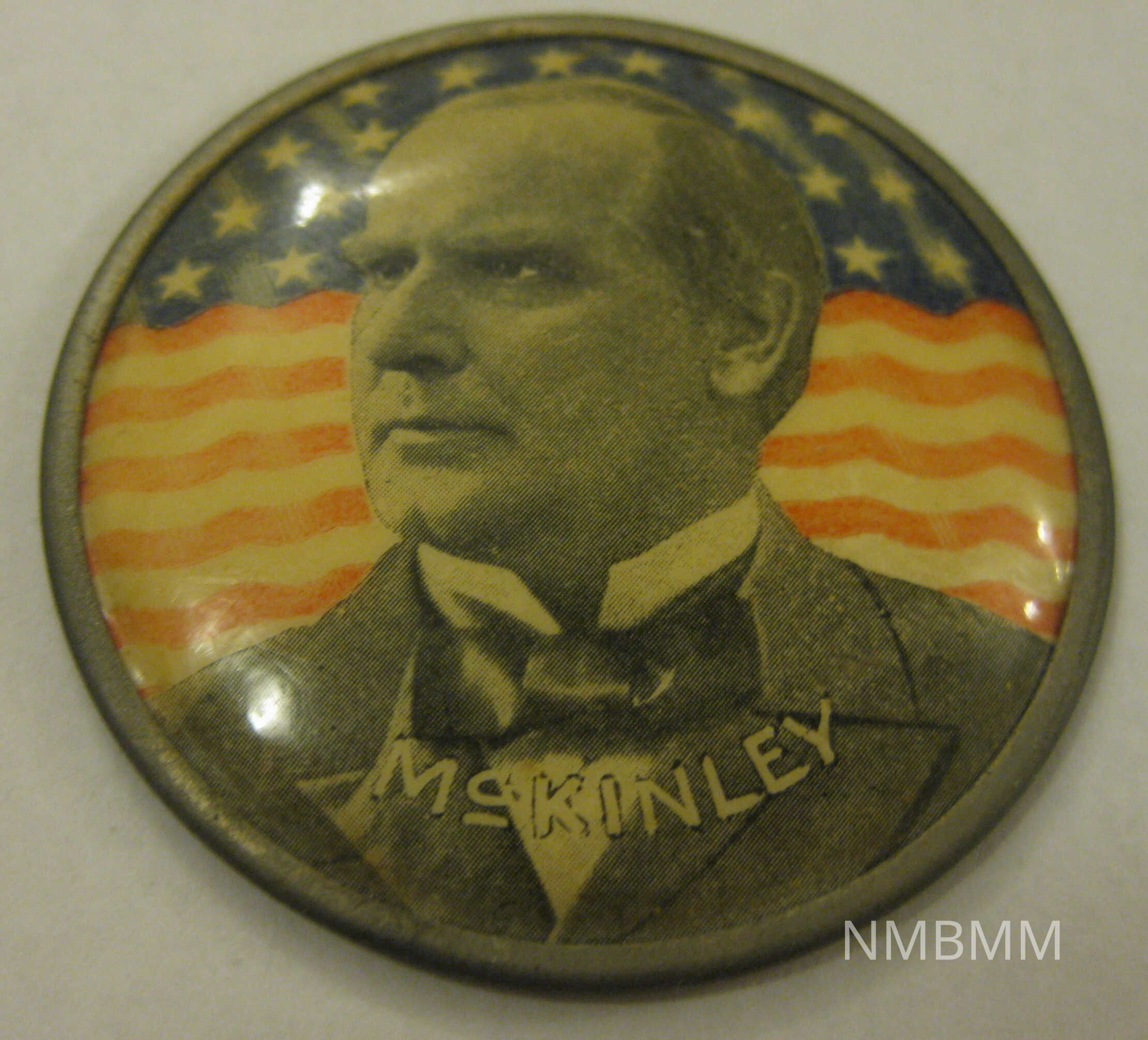 The item is part of a McKinley medal that is missing the ribbon portion. It features a black and white McKinley image with a red, white, and blue flag background. It has white lettering saying, "McKinley" under his bow tie.1.75 inch diameter.Collection