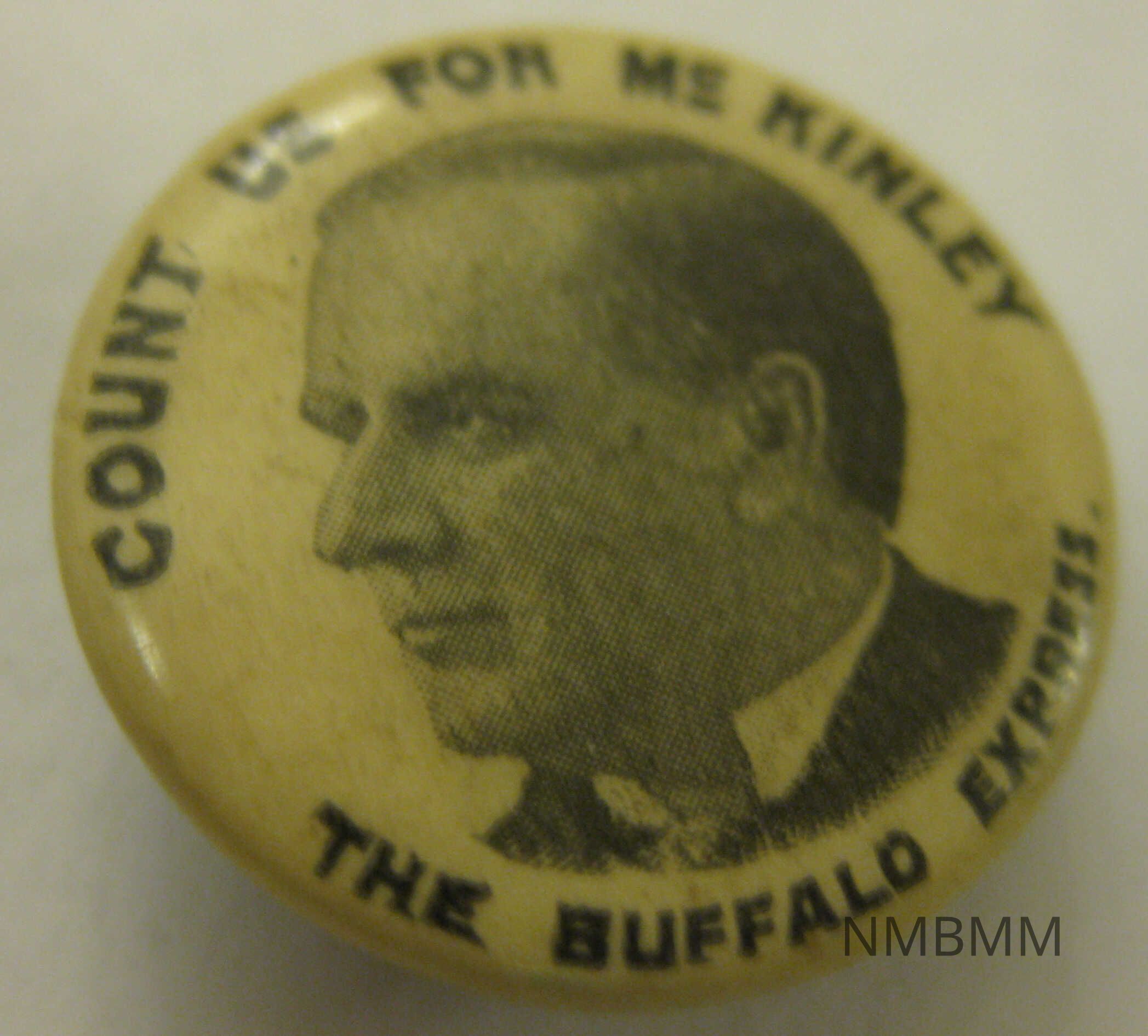 The item is a black and white McKinley pin with a button back. It features a black and white portrait of McKinley with black lettering. It was made by the Whitehead and Hoag Co. .75 inch diameter. The text says, "Count Us For McKinley The Buffalo Express."