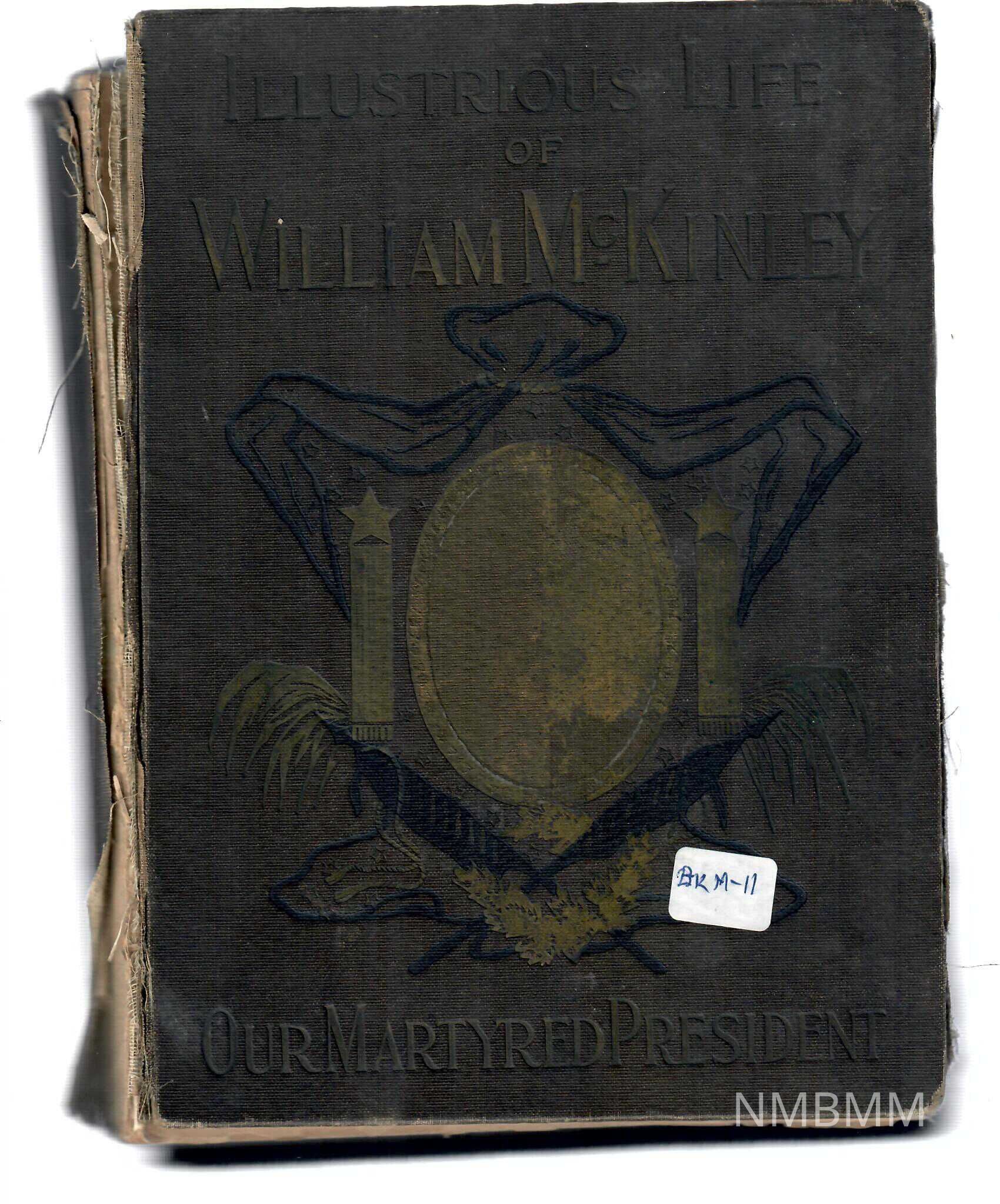 Biography of Wiliam McKinley. "The Illustrious Life of William McKinley, our Martyred President" by Murat Halstead. On title page: The true story of the assassination, in the shadow of death, passing away, funeral ceremonies. Together with his ancestry, boyhood, student days, his career as a soldier, lawyer, statesman, governor, and president, the principles for which he stood and the triumphs he achieved, and his home life. Anarchy, its history, influences and dangers, with a sketch of the life of the assasin. Superbly illlustrated with numerous engravings made from original photographs. 464 p. ; black & white illustrations ; 7.25 x 10.75 in. Brown leather binding with gold embossed lettering and black/white/grey photo of McKinley on black/gold embossed shield. Poor condition; pages torn & colored with age; binding loose; cover faded and edges worn; spine torn.