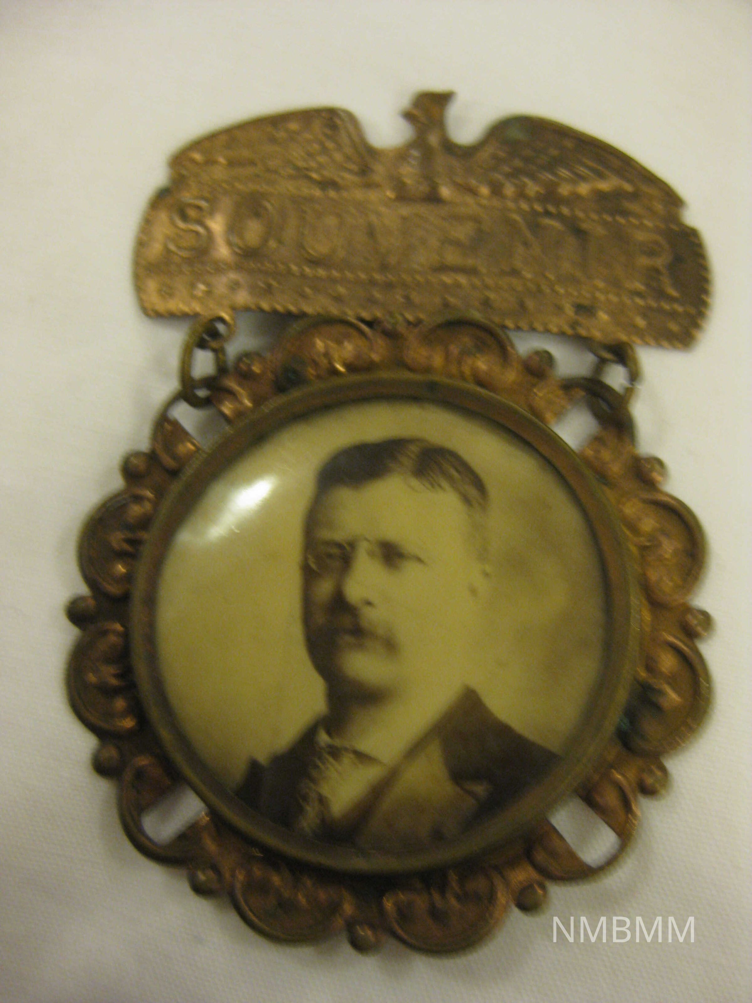 Dangling pin featuring black and white image of Theodore Roosevelt. The word souvenir is engraved with an eagle at the top.Collection