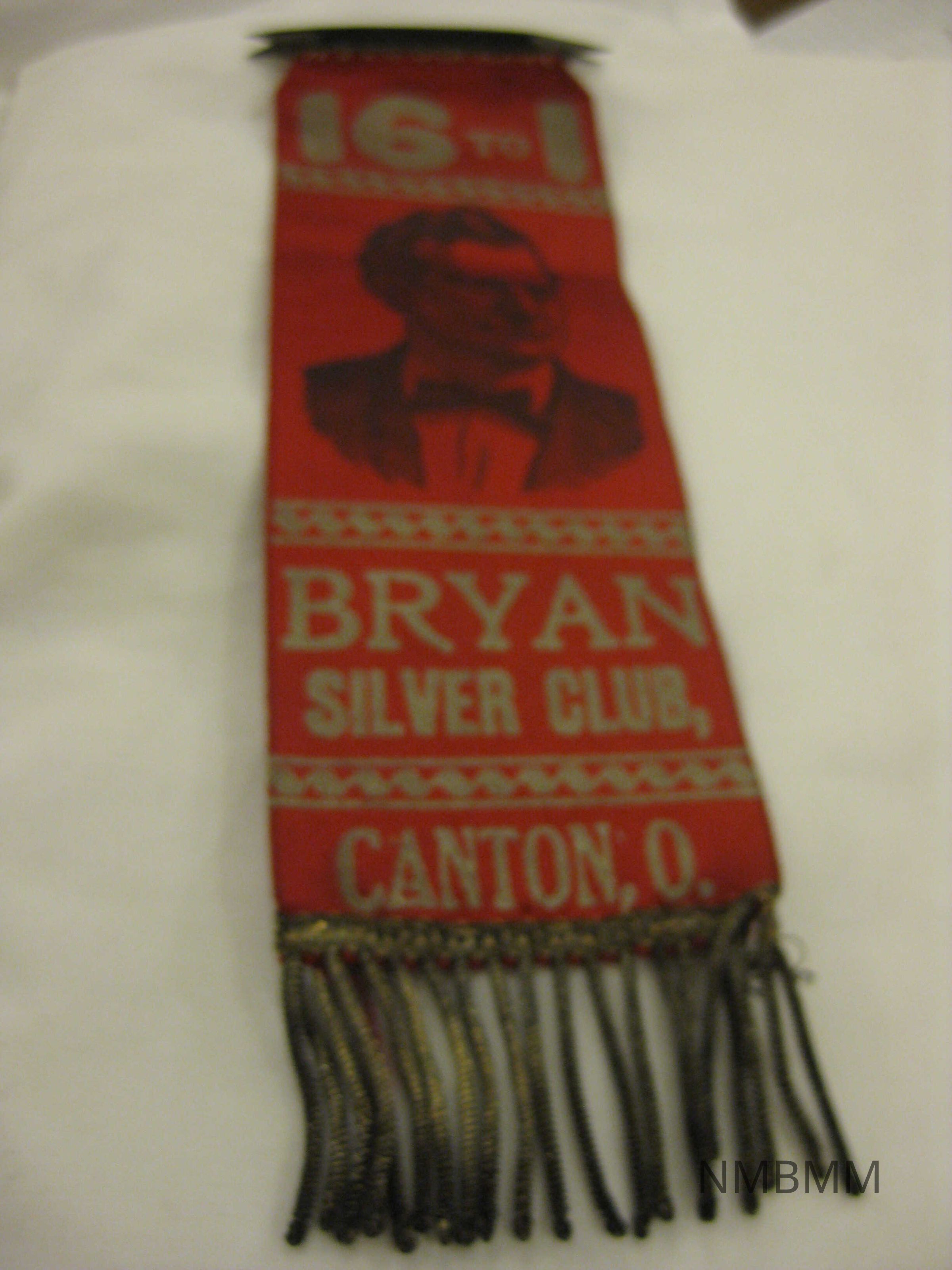 Red Ribbon of Bryan with Fringe, brass pin on top, drawn with image of Bryan. Text: "16 to 1, Bryan Silver Club, Canton, OH"Collection