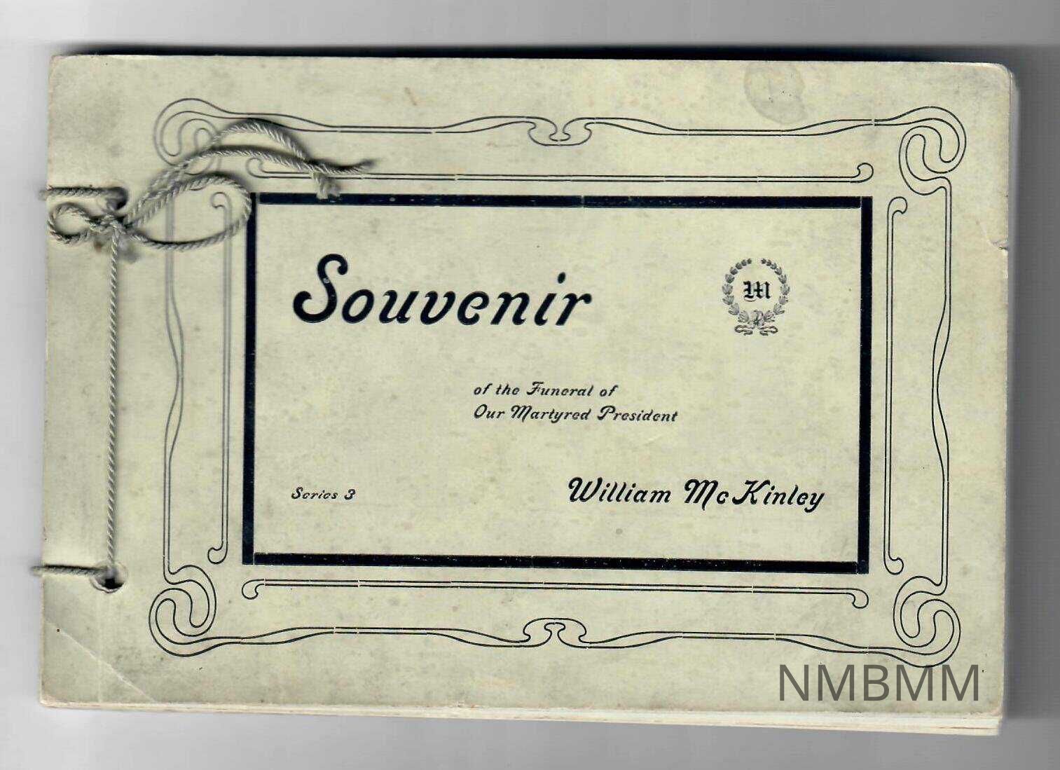 The book is titled "Souvenir of the Funeral of Our Martyred President William McKinley," and is a photographic album of his funeral. It is white with black lettering and designs and a "W" on the cover surrounded with olive branches. It is bound with green string. It was published in 1901 by The Enterprise Printing Company in Canton, Ohio.