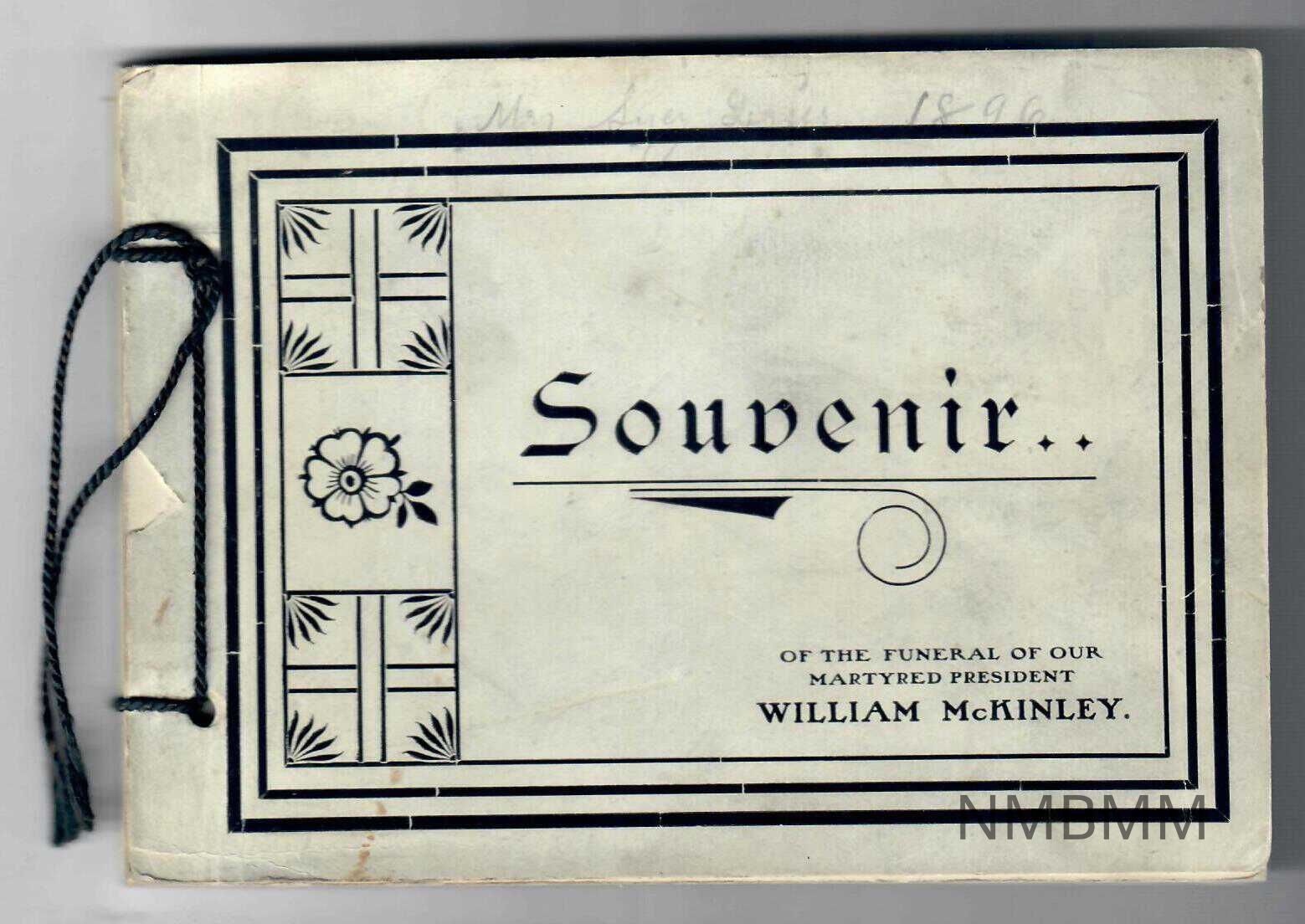 This book is titled "Souvenir .. of the Funeral of Our Martyred President William McKinley." A photographic album of his funeral, the cover is white with black lettering and designs surrounded by black borders and bound with black string. It was published in 1901 by The Watts Printing Co. in Canton, Ohio. On the cover written in pencil is ["Mrs Suey Linsis 1896."]