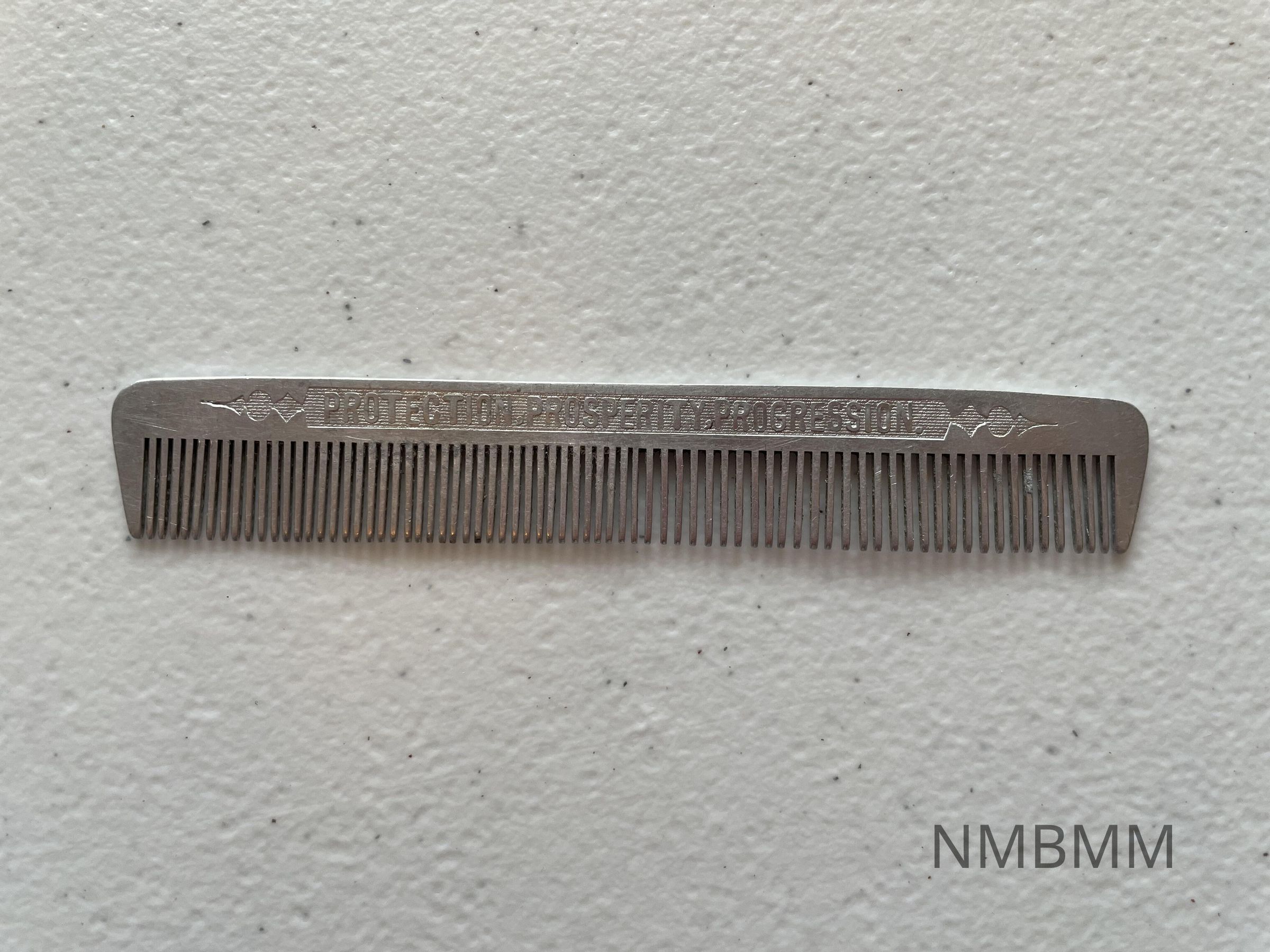 This item is a silver hair comb, with "Protection, Prosperity, Progression on one side, and "1901 McKinley and Roosevelt 1901" on the other.