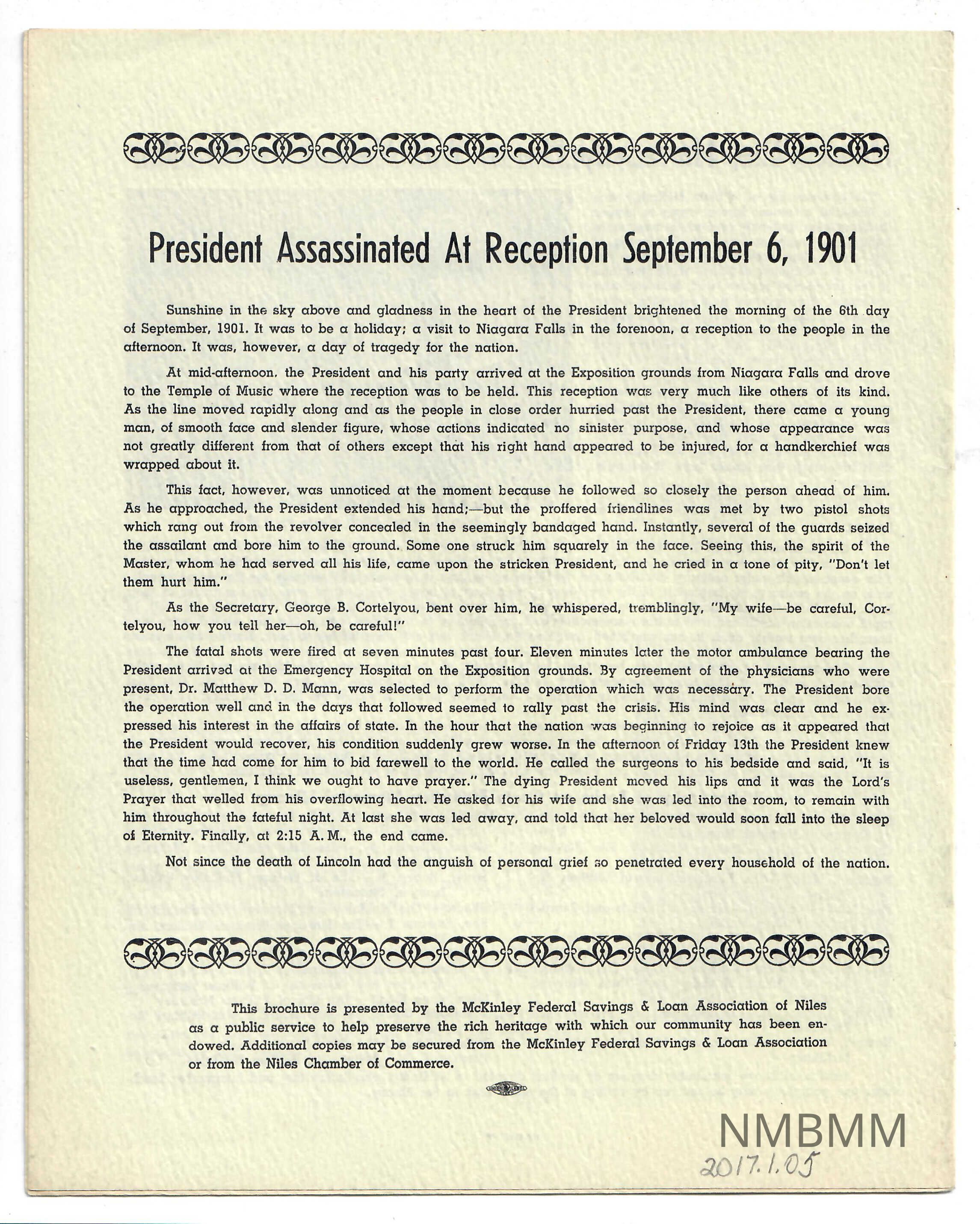 Eight-page booklet presented by the McKinley Federal Savings and Loan Bank on the sesquicentennial of Ohio. This book gives a brief biography of William McKinley. briefly examines McKinley's three great achievements, gives the history of the memorial building, lists anecdotes about McKinley, lists a chronology of William McKinley, examines the history of Niles, examines the McKinleys' marriage, and briefly describes McKinley's assassination. The front of the booklet features a photo pf McKinley in the center. The title is above the photo in black letters. The subtitle is below the photo, in black letters. The Ohio Sesquicentennial logo is on either side of the photo in black. All are on off-white paper. The book is center-stapled. the back of the booklet feature a decorative scroll design at the top of the page, with the article about the assassination below it. another row of decorative scrollwork separates the article from information about how to obtain other copies of the booklet.Collection