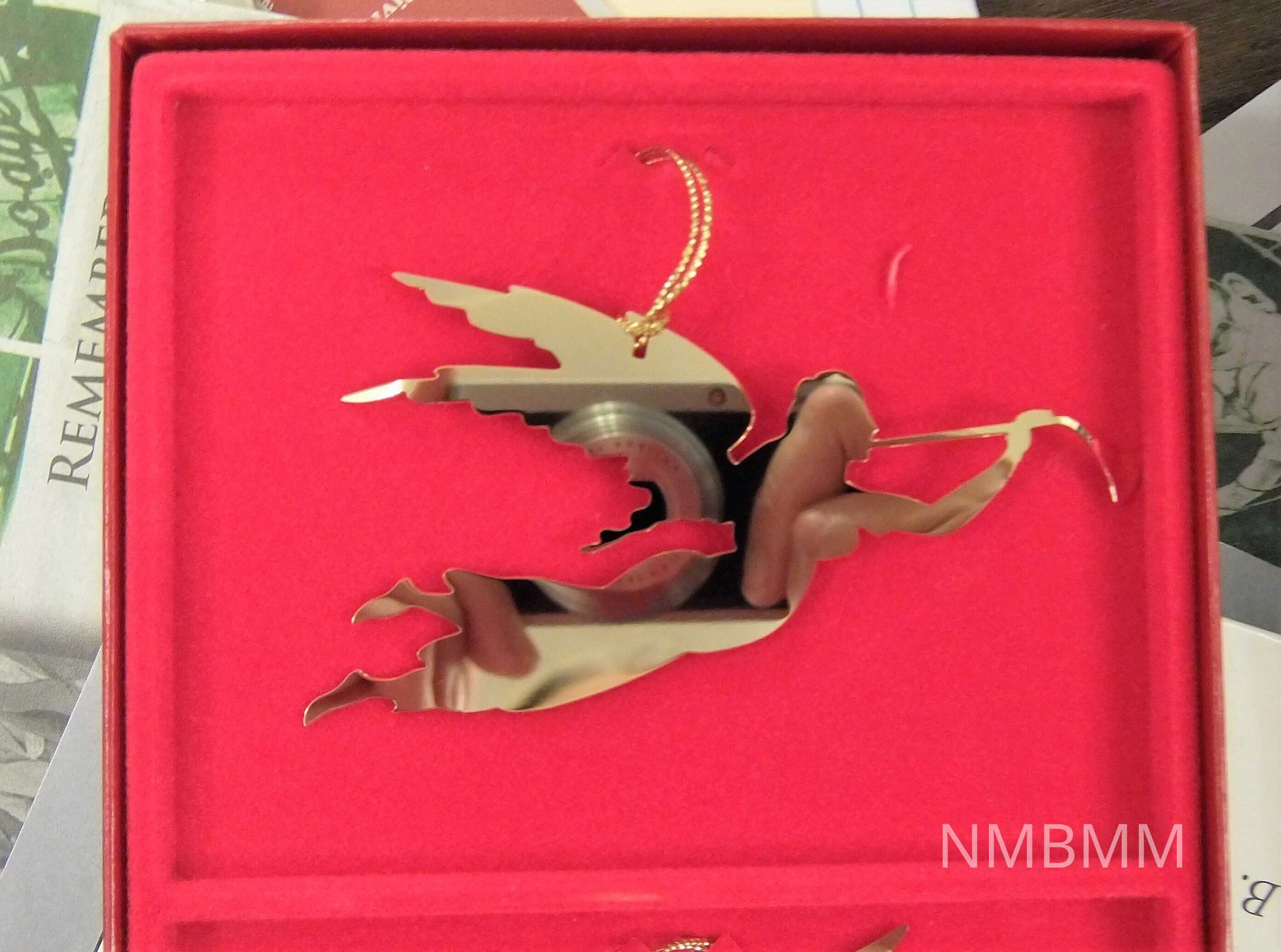 This ornament is part of the White House Historical Association's series of collectible ornaments. It is the first in the series. The ornament is "a faithful hand-crafted miniature replica of the famous angel weathervane made in 1840 in Charlestown, Massachusetts for the Universalist Church in Newburyport." "The original ornament was on the tree has in the Blue Room of the White House during the 1981 Christmas season." The gold plated ornament is of an angel in flight with a trumpet. A gold hanging cord is attached.
