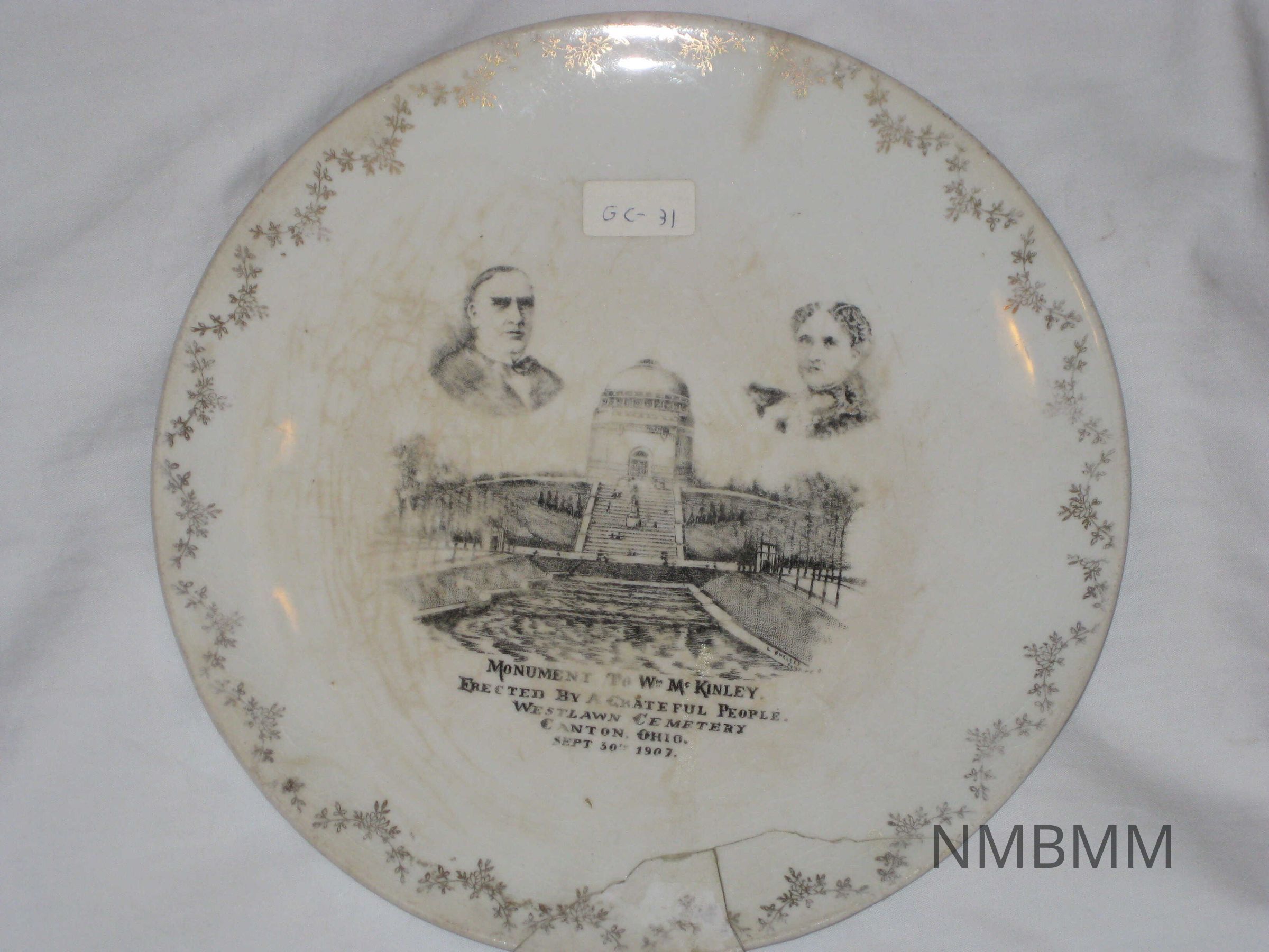 The item is a plate commemorating the Canton McKinley Memorial. It is a white plate with a gold flower border and images of the monument and McKinley and his wife near the top of the plate. The text reads " Monument to Wm. McKinley, erected by a grateful people. Westlawn Cemetery, Canton, Ohio, September 30, 1902." There are a few pieces that were previously broken off and glued back together.Collection