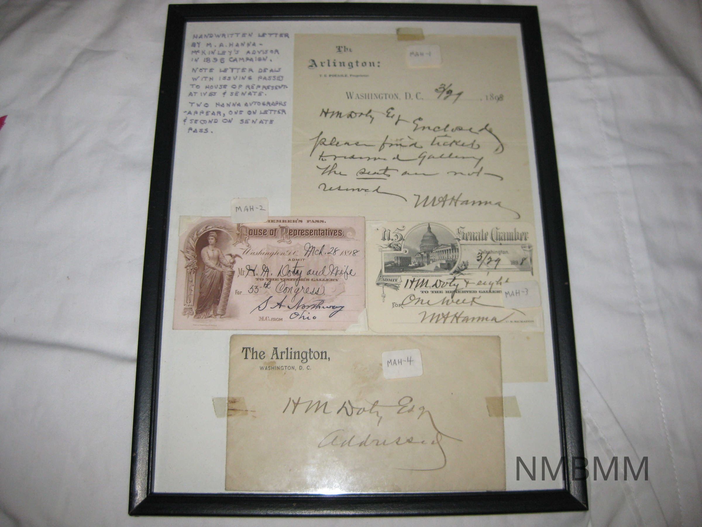 This item is a framed letter from M.A. Hanna, McKinley's advisor during the 1896 campaign. The letter deals with issuing passes to House of Representatives and the Senate. It also contains two Hanna autographs, one on a letter and one on a Senate pass.