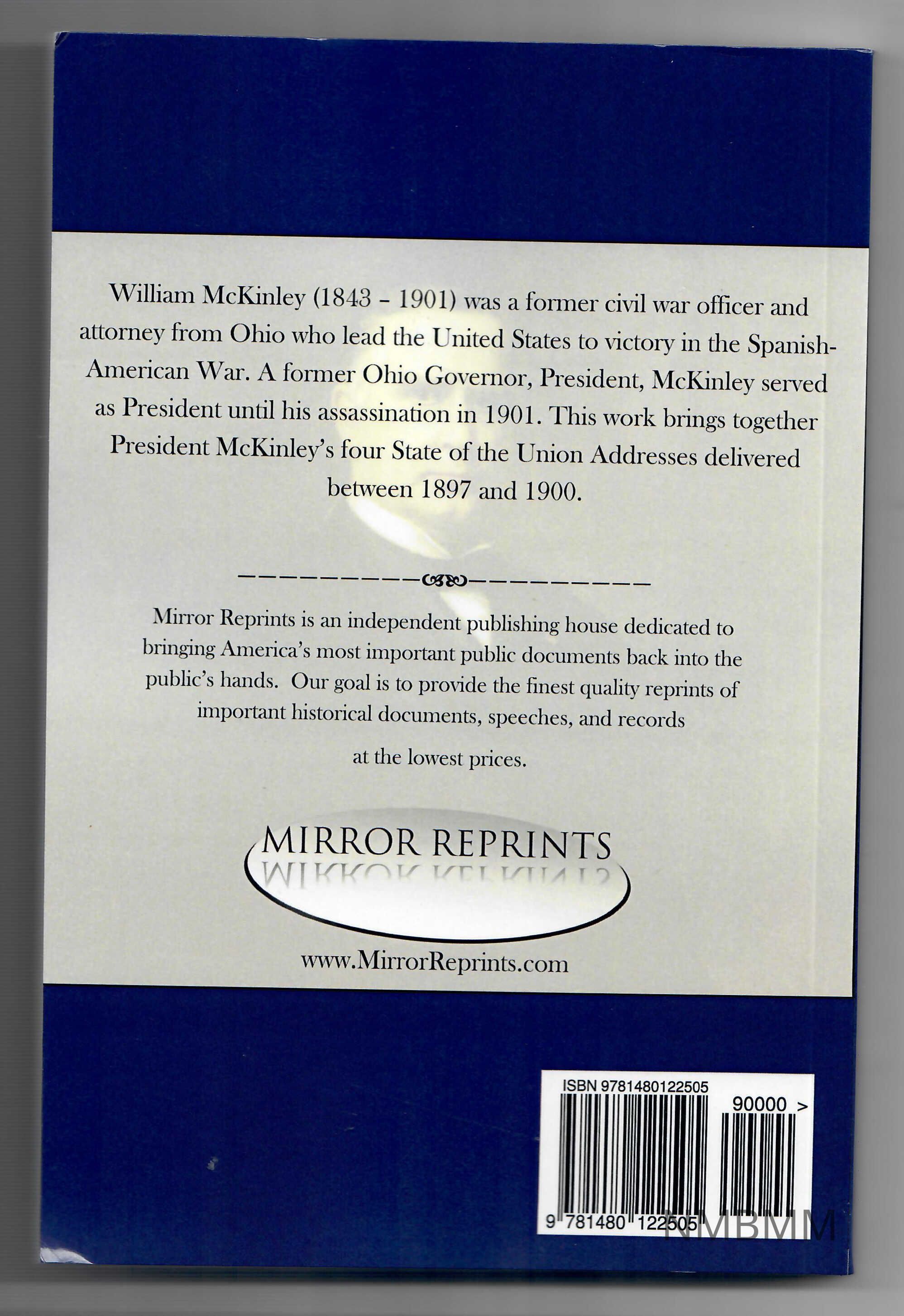 This work is a collecction of all four of William McKinley's State of the Union addresses between 1897 and 1900. The book is a paperback. The front cover features a color portrait of William McKinley. The title is in white letters on a nnavy blue background, surrounding the portrait. The notation "volume 23 Presidential History Series" is at the upper right corner, in white letters on a red triangle. The back cover has a wide strip of navy blue at the top and bottom. The middle consists of a beige background, with black letters. The text gives a brief biography of McKinley, and also describes the book. The text also describes the purpoe of the Publisher, Mirror Reprints, and contains the company's logo. The ISBN and bar code are near the lower right corner. The book is a paperback. The front cover features a color portrait of William McKinley. The title is in white letters on a nnavy blue background, surrounding the portrait. The notation "volume 23 Presidential History Series" is at the upper right corner, in white letters on a red triangle. The back cover has a wide strip of navy blue at the top and bottom. The middle consists of a beige background, with black letters. The text gives a brief biography of McKinley, and also describes the book. The text also describes the purpoe of the Publisher, Mirror Reprints, and contains the company's logo. The ISBN and bar code are near the lower right corner.