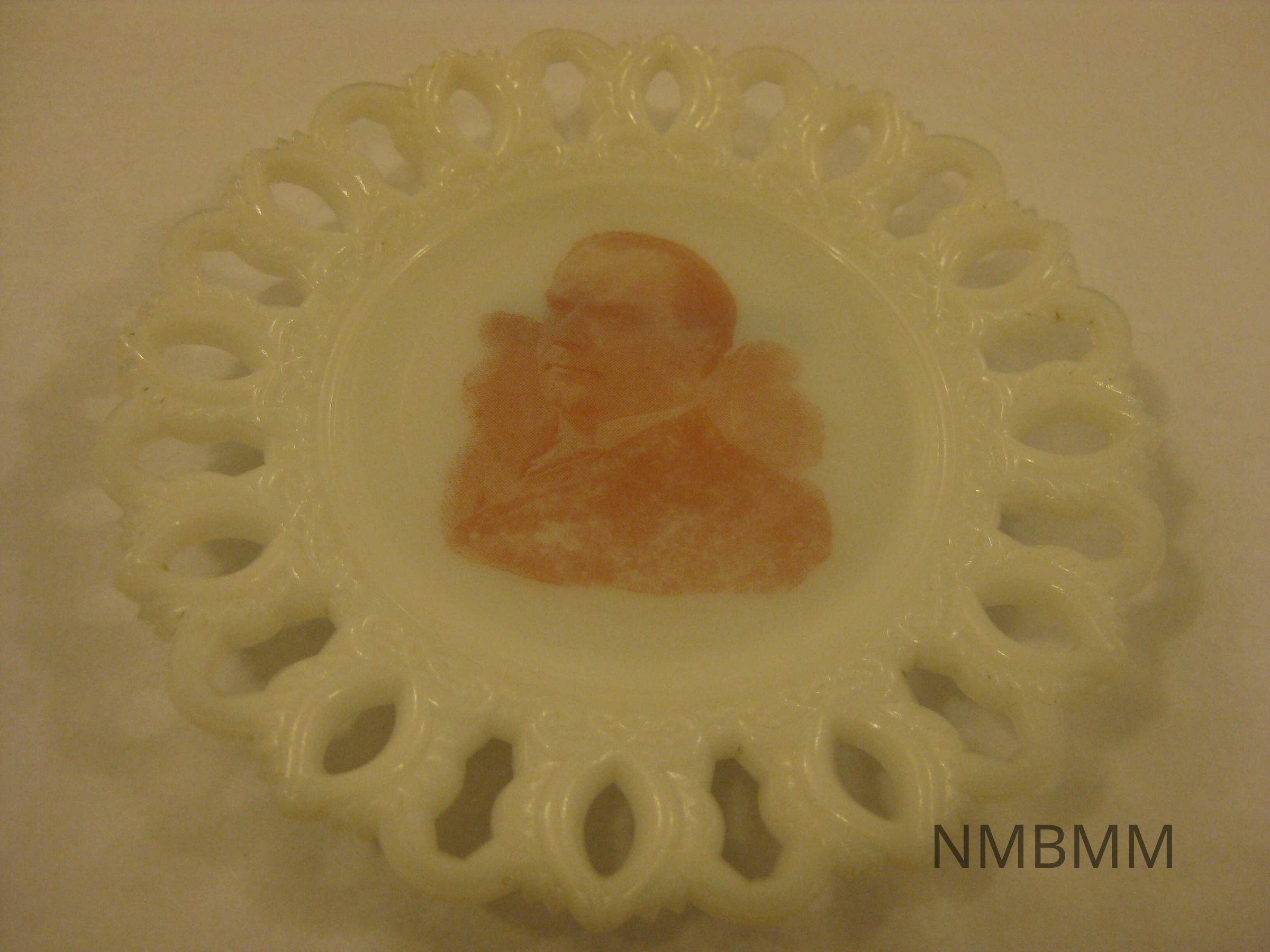 This item is a small white plate with a portrait of McKinley in the center done in a red tone. The edges are decorative scallops. It measures 5.25" in diameter.Collection